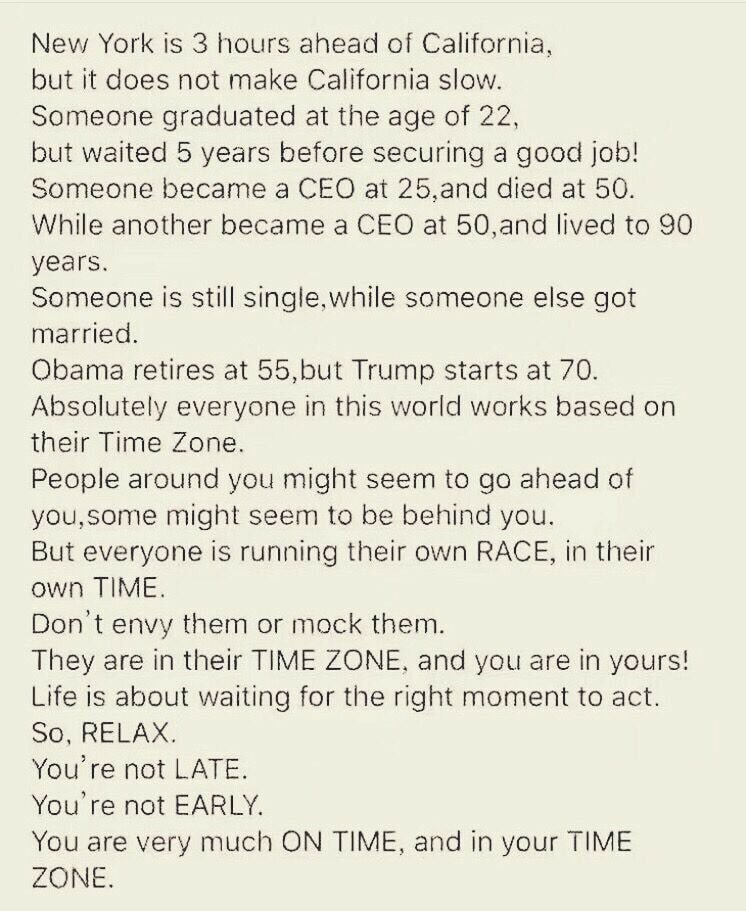 어떤 사람은 22살에 대학을 졸업했지만 5년을 기다린 끝에 좋은 일자리를 얻었습니다. 어떤 사람은 25세에 CEO가 된 후 50세에 죽었습니다. 반면 또 어떤 사람은 50세에 CEO가 되어 90세까지 살았습니다. 어떤 사람은 아직 미혼인데 어떤 사람은 이미 결혼을 했죠. 오바마 대통령은 55세에 은퇴를 하는데 트럼프 대통령은 70세에 시작합니다.