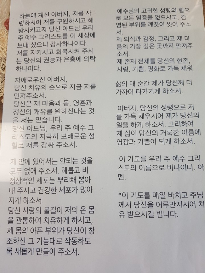 제 안에 있어서는 안되는 것을 모두 없애 주소서. 해롭고 비정상적인 세포는 뿌리채 뽑아내 주시고 건강한 세포가 많아지게 하소서.