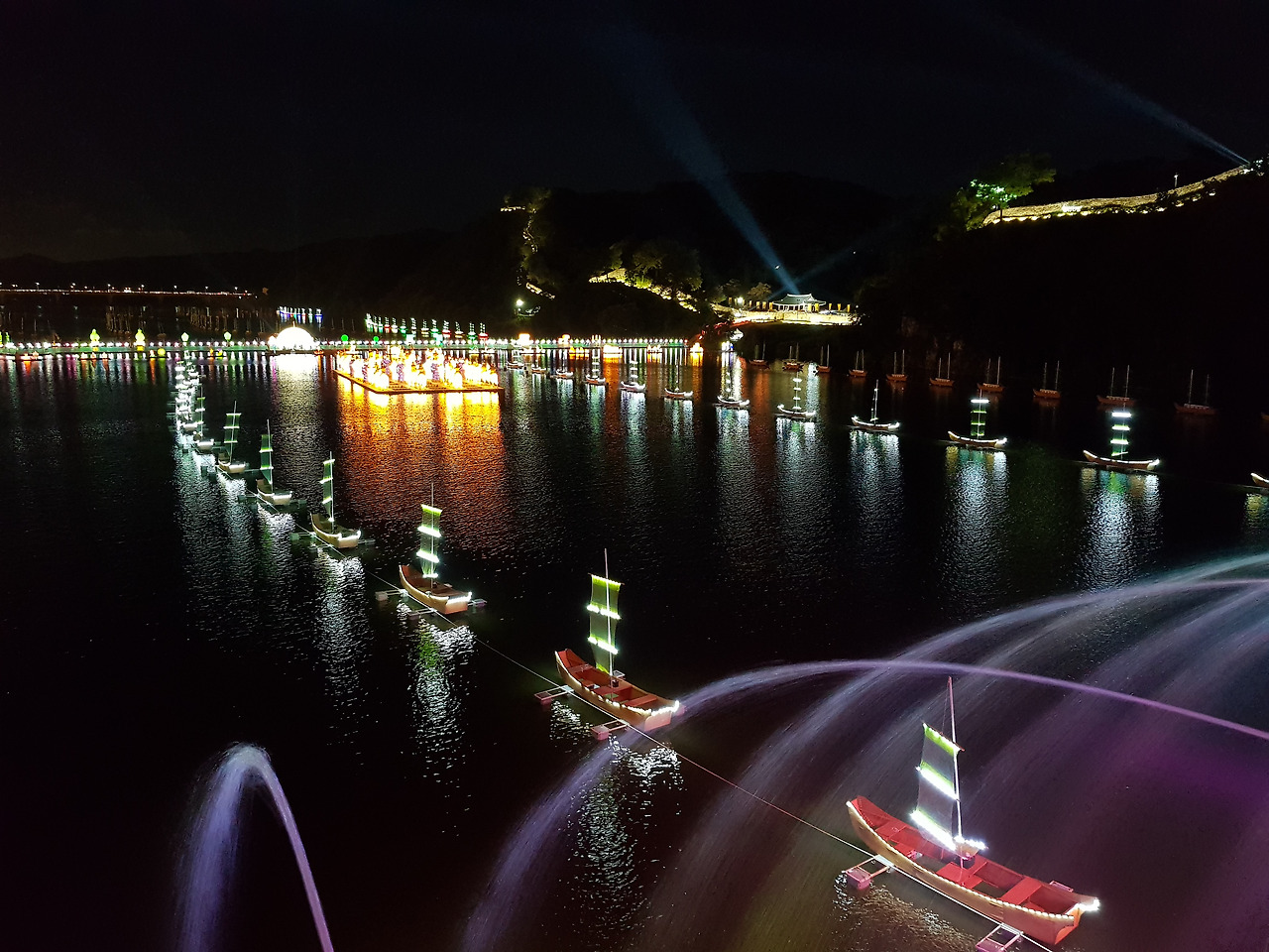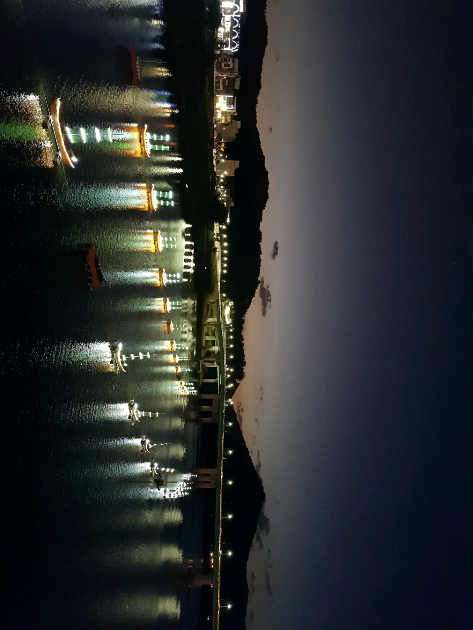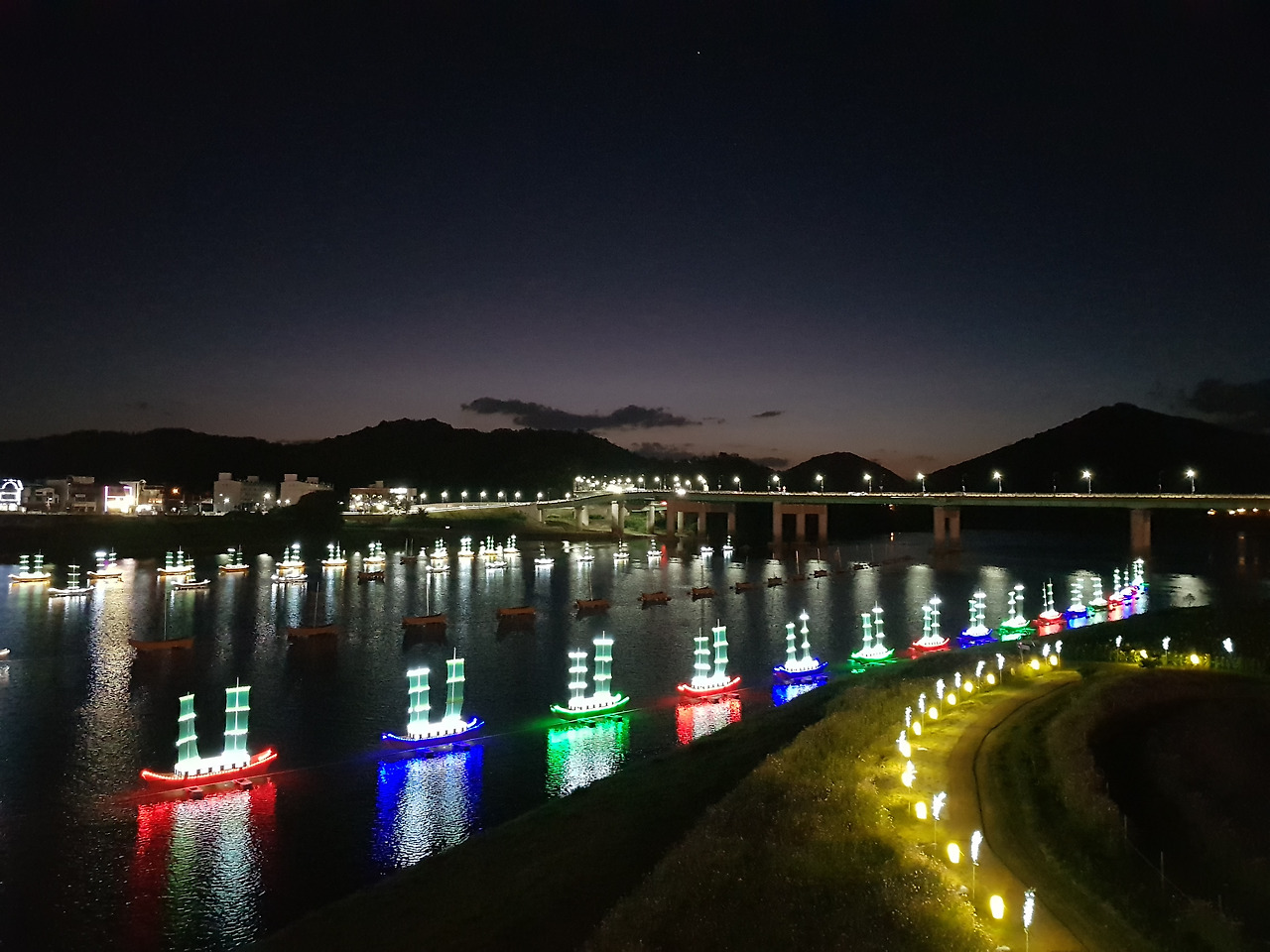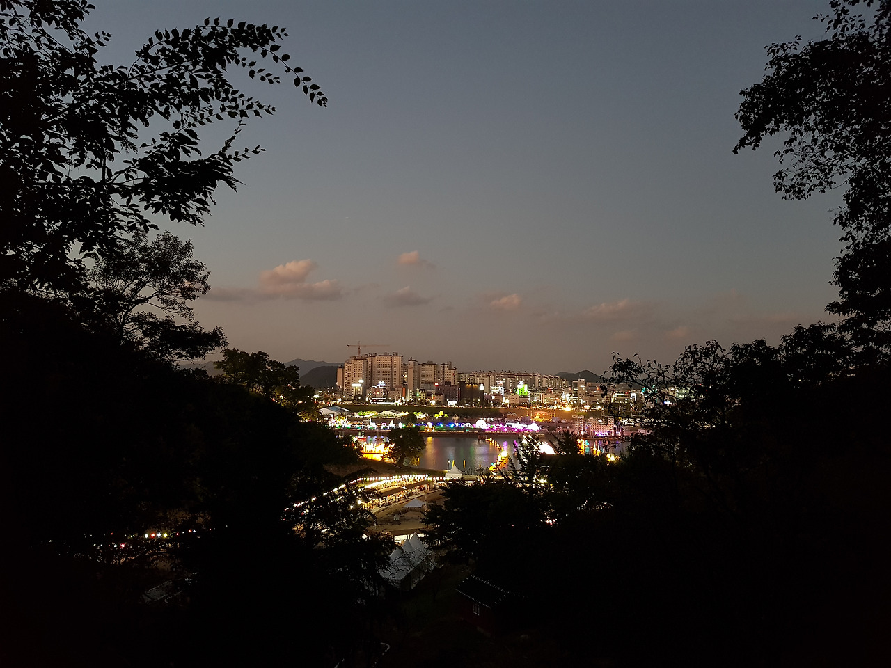 안쪽 숲길을 조금은 빠른 길로 지나치자 오른 편으로 다시 금강이 보이기 시작했다. 햇살이 닿던 그곳에 어둠이 깔리자 전혀 새로운 모습이 되었다. 내가 살던 키타큐슈의 온가강은 인공적인 조명이 별로 없었는데 이곳은 역시 관광지가 맞았다. 금강 위에서 열병식을 하던 목조 돛단배들이 형형색색의 빛을 띠며 화려한 밤을 수놓고 있었다. 여수 밤바다를 생각나게 할 야경이 연출되었다.