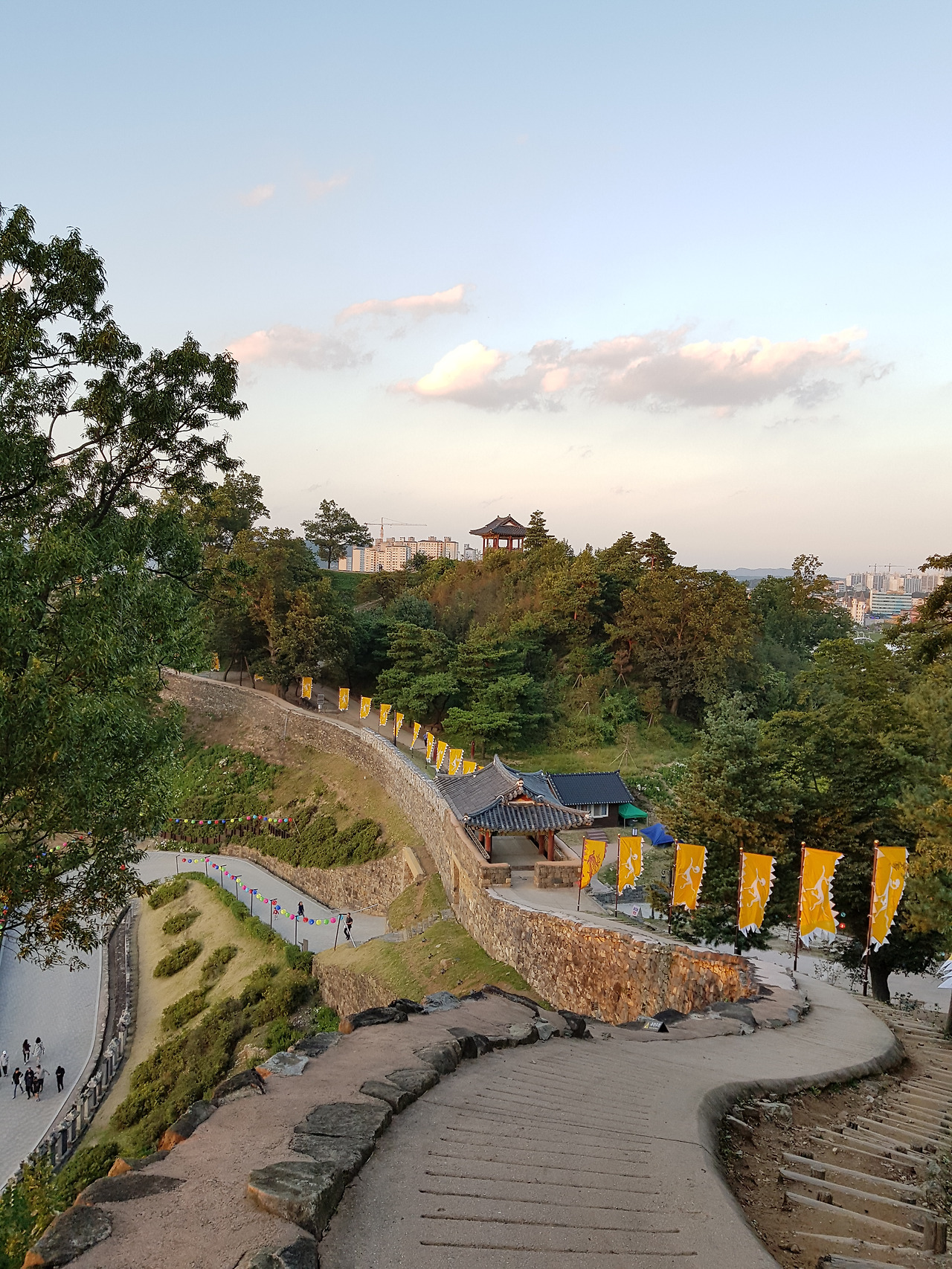 해가 지려고 폼을 잡길래 더 어두워지기 전에 공산성을 오르고자 했다. 지난 전라도 여행 때 낙안읍성을 방문했었는데 평지 초가마을을 나즈막히 둘러싼 그곳에 비하면 공산성은 꽤 가파른 지형에 높은 구조물로 자리하고 있었다.
