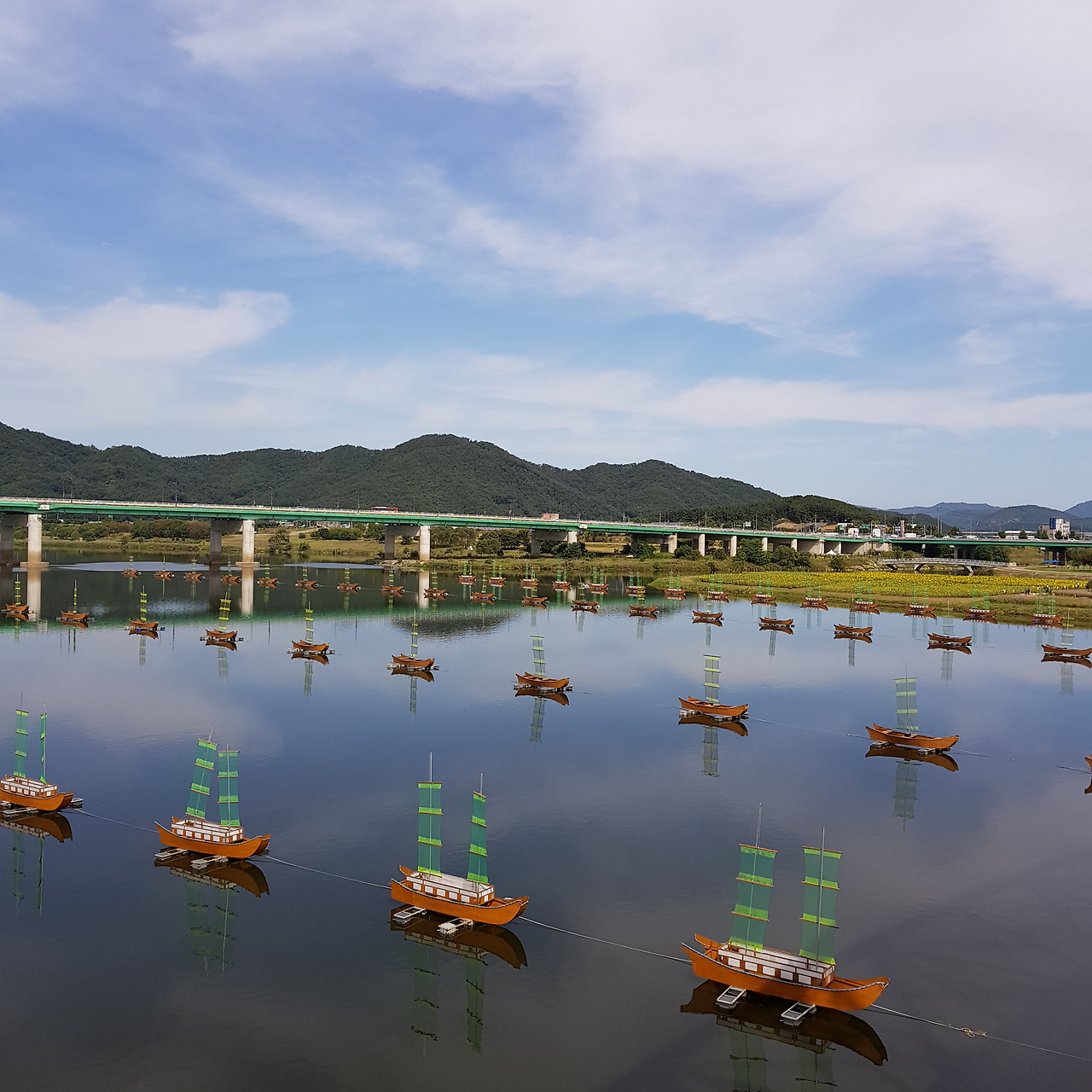 물이 흐르는지 느껴지지 않는 잔잔한 강 위로 나무 돛단배들이 열병식을 하고 있었다. 금강을 가로지르는 금강교는 축제 기간동안 차량통행을 막아 놓았다. 금강교를 공산성 쪽에서 들어가 반대 방향으로 걸어가며 좋은 각도의 풍경을 담기 위해 노력했다.