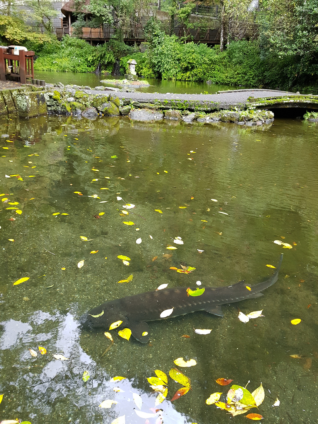 야트막한 물 아래로 잉어들이 산책하고 있었고 아기 오리들도 줄을 맞춰 기차놀이를 하고 있었다. 눈아래로 갑자기 시커멓고 제법 덩치가 커다란 녀석이 어슬렁거리기 시작했다. 한번에 정체가 무엇인지 알아차리지 못한 나는 녀석의 움직임을 따라 눈동자를 이리저리 굴렸다. 물고기에 대한 지식이 부족했기 때문에 그때 본 것이 혹시 상어가 아닐까 짐작만 했다. 여하튼 이런 정원의 연못에서 발견할 거라 상상하기 어려운 놈이었다.