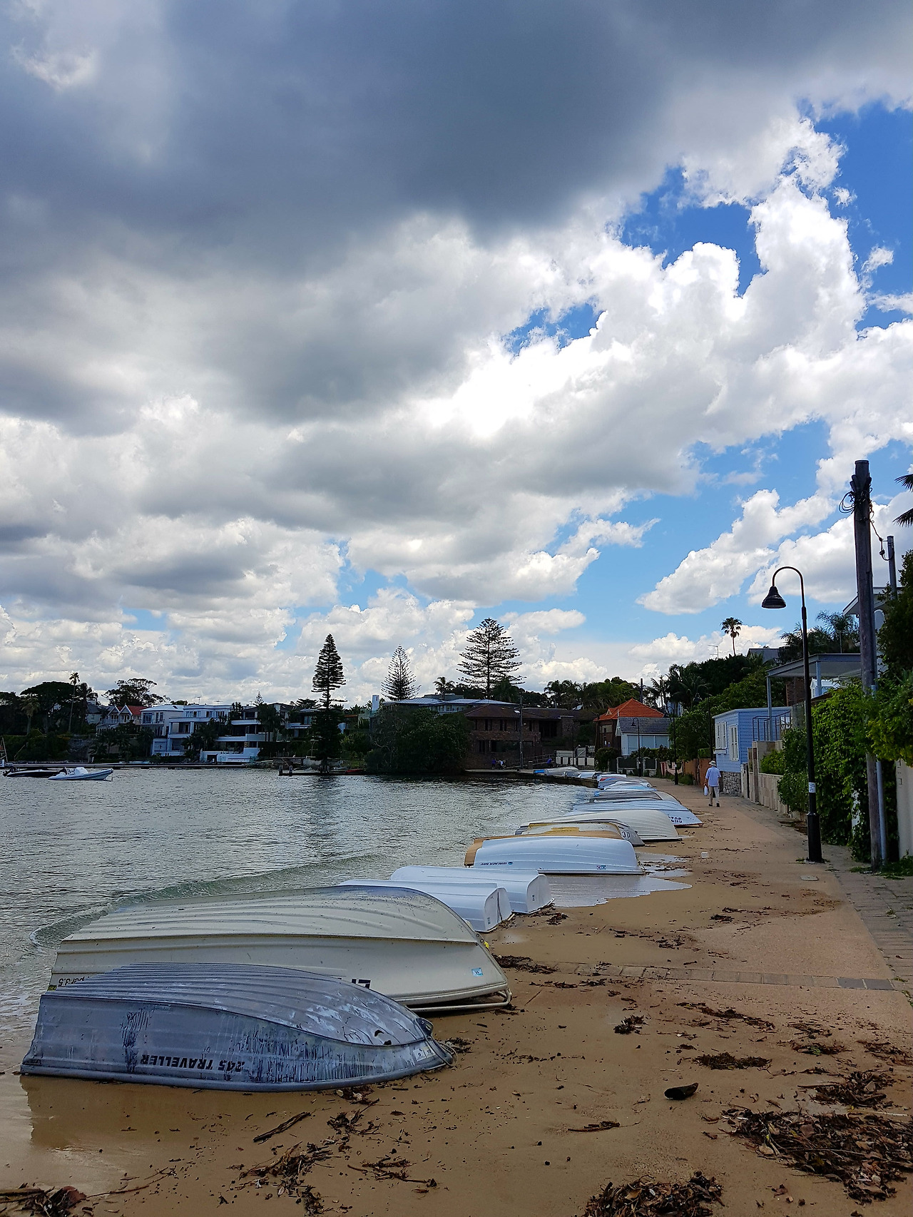 남반구 바닷가에서 비에 흠뻑 젖다.
