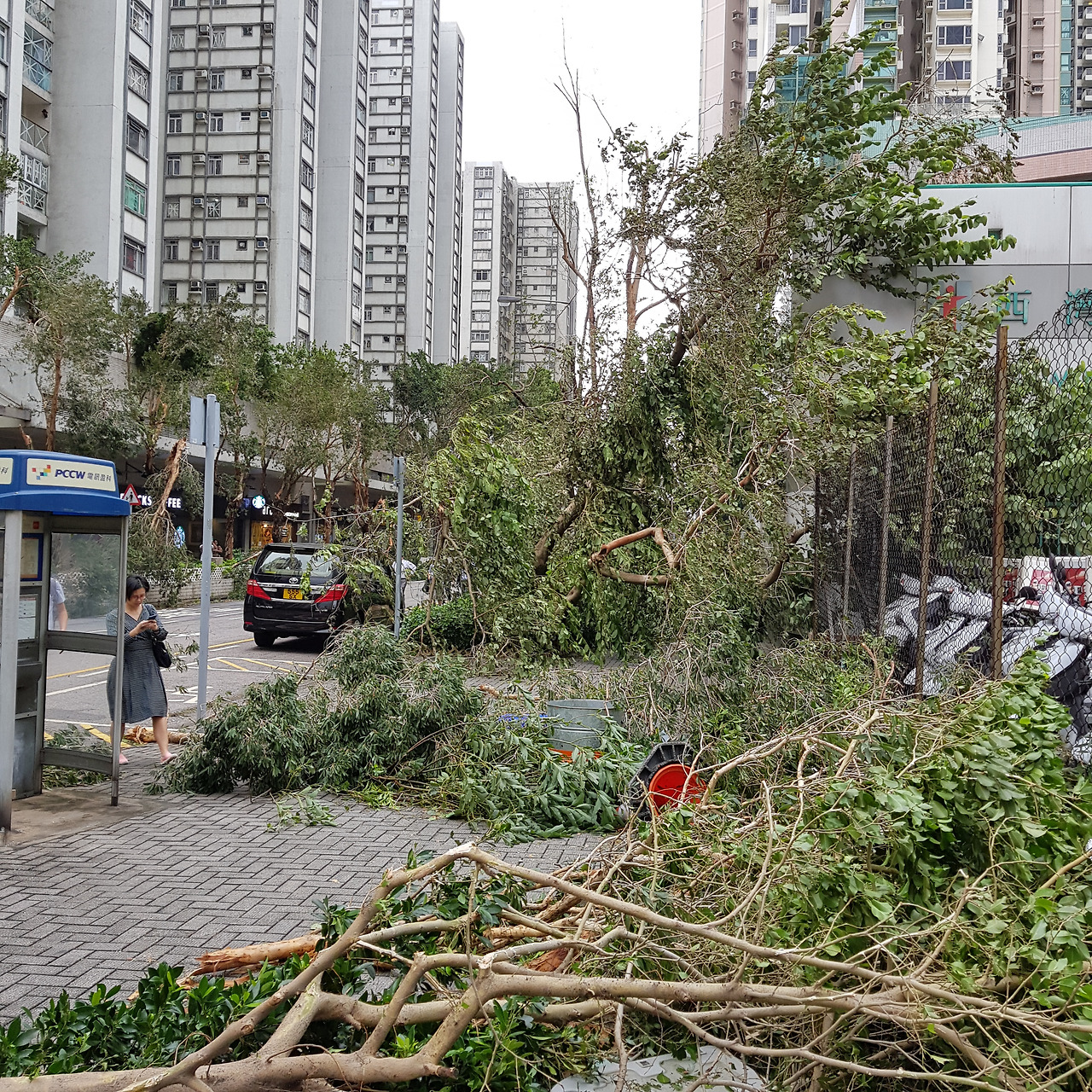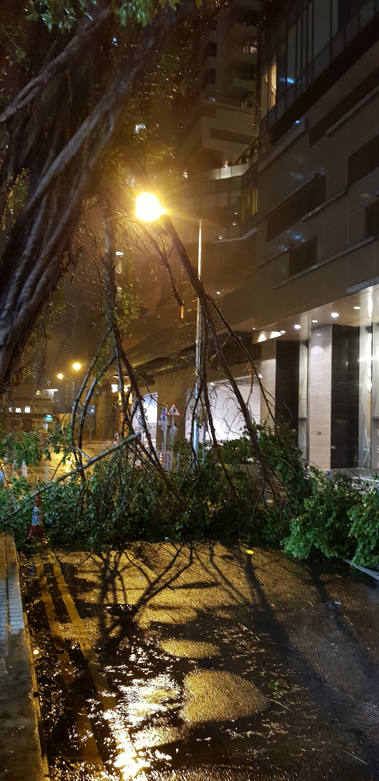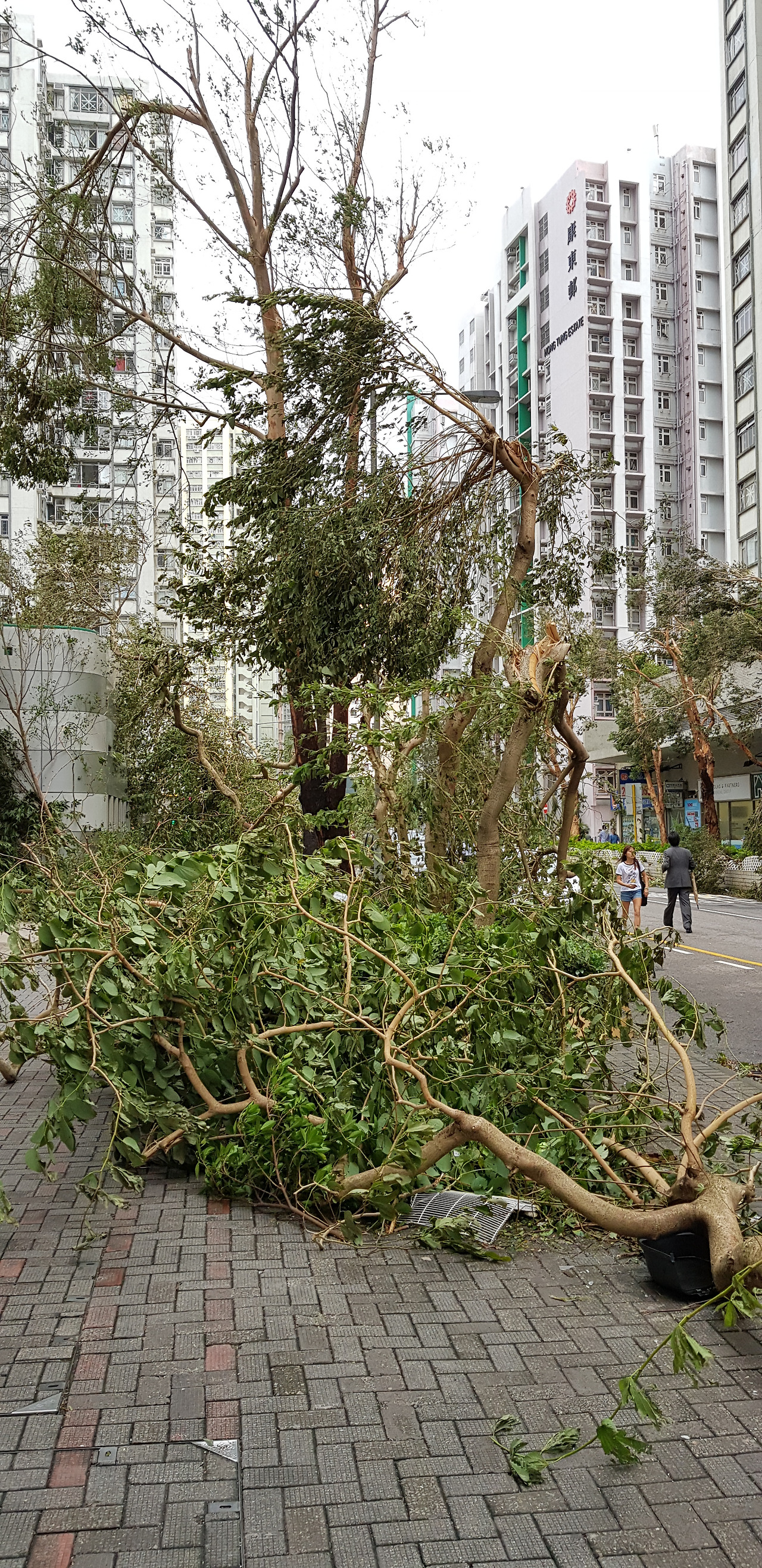 그라운드층(우리의 1층에 해당)으로 가서 건물 밖으로 나오니 여기가 과연 어젯밤 내가 들어왔던 길인가 싶었다. 특히 높게 솟아 있던 가로수들이 꺾여 큰길을 가로막아 버린 광경을 목도하면서 이번 태풍이 얼마나 파괴력이 컸는지 짐작할 수 있었다. 만일 나무가 쓰러질 때 근처를 거닐고 있었다면 목숨이 위태로울 봉변을 당할 수도 있었을 것이다. 오래전 어떤 기사에서 들었던 이야기가 있다. 과거 홍콩의 태풍으로 인해 간판이 떨어져 날아가 길을 가던 행인의 머리를 강타해 사람이 즉사했었다고 한다. 이번 태풍은 너무도 강력해 홍콩 시민 대부분은 미리 경고를 접하고 바깥출입을 자제해서 이런 피해가 적지 않았을까 기대해 보지만 각종 뉴스와 시민들의 제보를 보니 더 하면 더했지 피해가 결코 작지 않을 것으로 보였다.