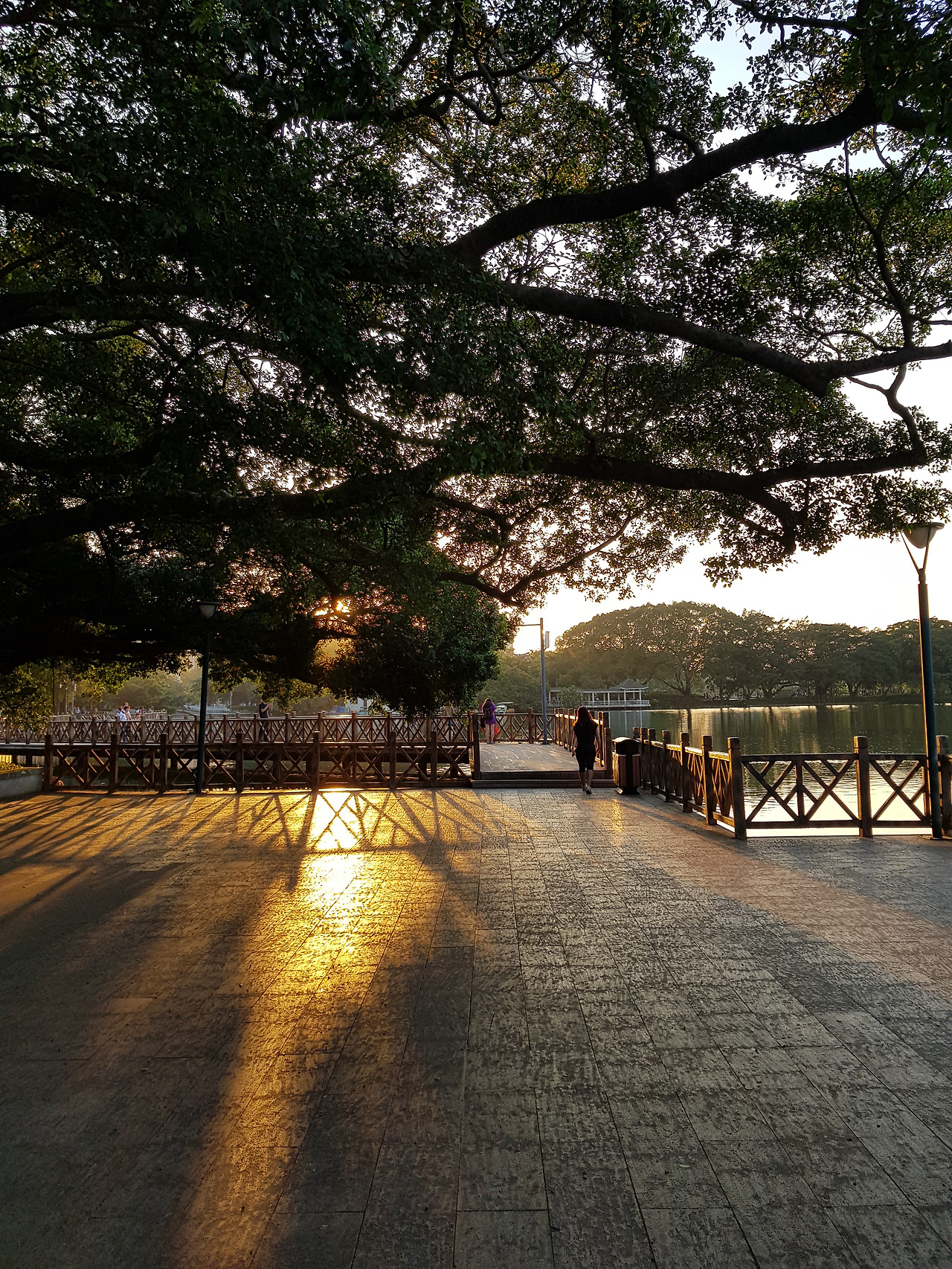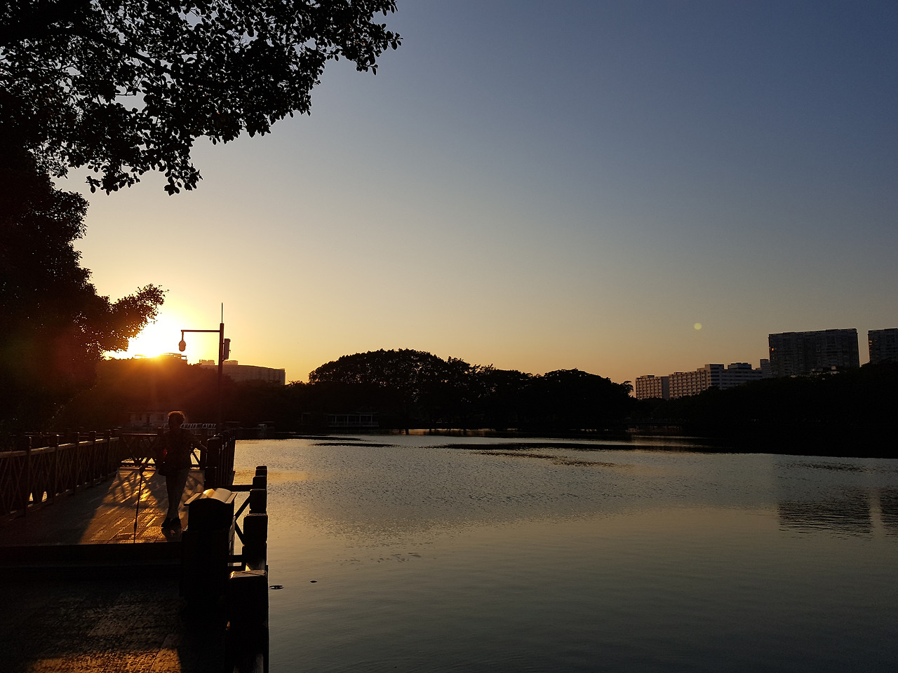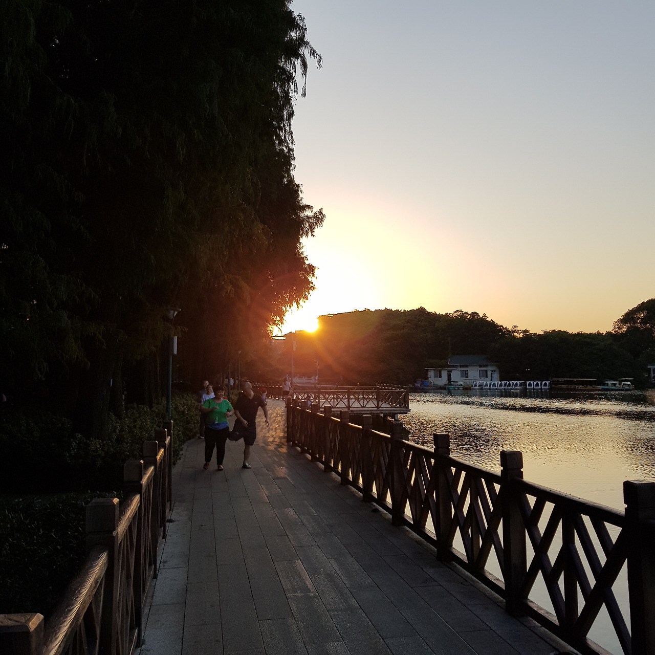 공기가 깨끗한 나라의 선명하고 몽환적인 저녁놀을 이곳에서 기대하기는 어렵지만 걷다 보니 해가 옆으로 떨어지고 있었다. 키타큐슈에서 살 때 퇴근할 무렵 날씨가 좋은 날 이렇게 태양빛이 옆으로 비치면 참 근사하고 행복한 느낌이 들곤 했다. 그리 기대하지 않고 간 류화후 공원에서 오랜만에 그 느낌 속으로 들어간 것이다.
