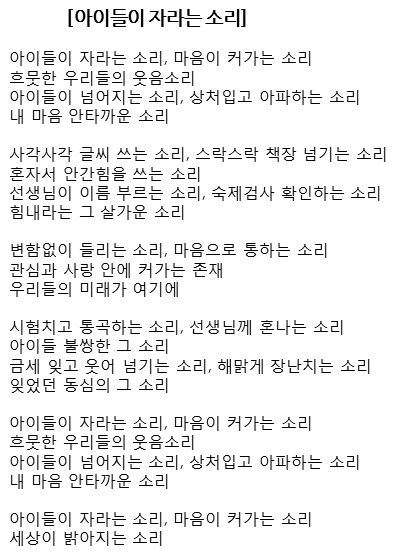 몇몇 구성원들과의 회의를 거치고 내 나름대로 고민한 끝에 곡을 선정했다. 원곡은 노래를 찾는 사람들의 '일요일이 다 가는 소리'라는 곡이다. 대학 시절부터 노래 동아리에서 자주 부르곤 했던 노래인데 이미 3부 정도의 화음은 알고 있었고 비트박스 같은 효과음을 넣어 부르면 짧은 시간 안에 듣기 괜찮은 곡을 만들 수 있으리라 생각했다. 개사는 원곡의 각운 즉, '무엇무엇 하는 소리'라는 표현을 살려 아이들이 교실에서 공부하는 현장의 모습과 선생님과 아이들의 마음을 헤아리며 새로 써 보기로 했다.