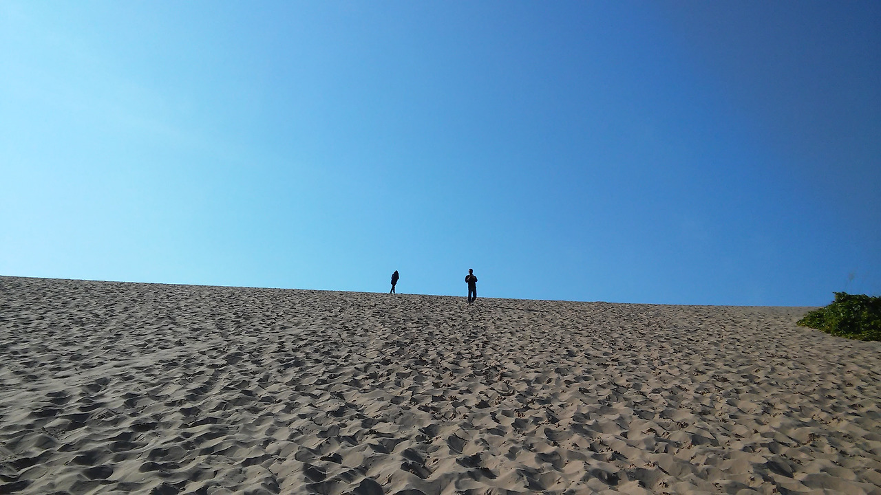 J가 깎아지르는 듯한 모래 경사지를 보면서 다른 사람의 에피소드를 얘기해 주었다. 보기엔 한 번 내려갔다 올라올 만해 보일는지 몰라도 아는 남자 분 하나가 자신 있게 내려갔다가 바로 올라오질 못해서 한참 고생했다는 거였다. 그 얘기를 듣자 이상하게 한 번 도전해 보고 싶은 욕구가 스멀스멀 올라왔다. 은근슬쩍 일행에게 우리 한 번 내려갔다 와볼까 하고 떠보았는데 반응이 영 시원찮았다. 실은 나 자신도 내려가면 제 발로 바로 올라오는 게 힘들지 모르겠다는 생각이 들 정도로 경사가 심해 보였다.