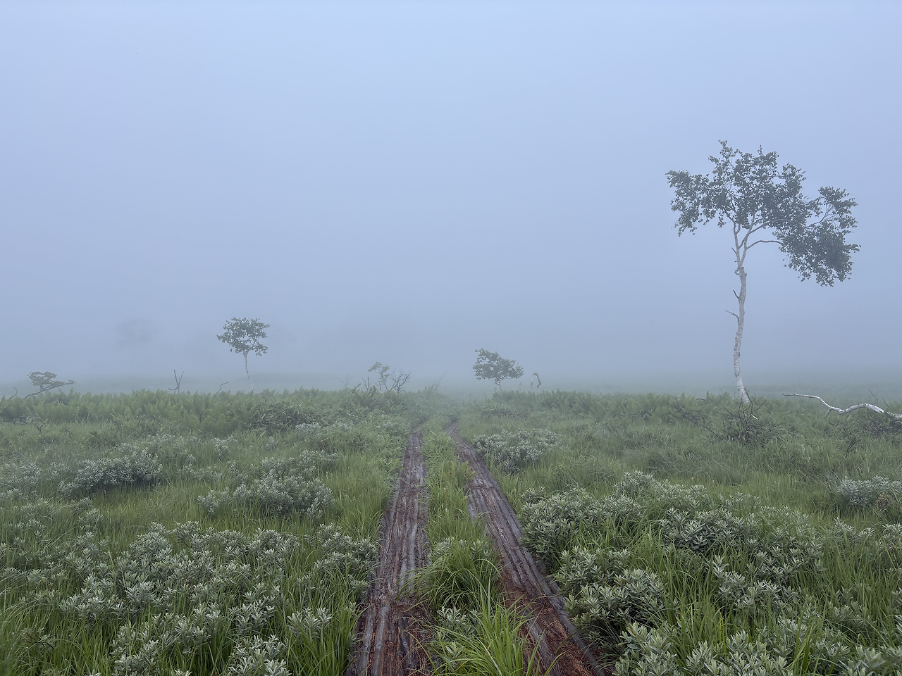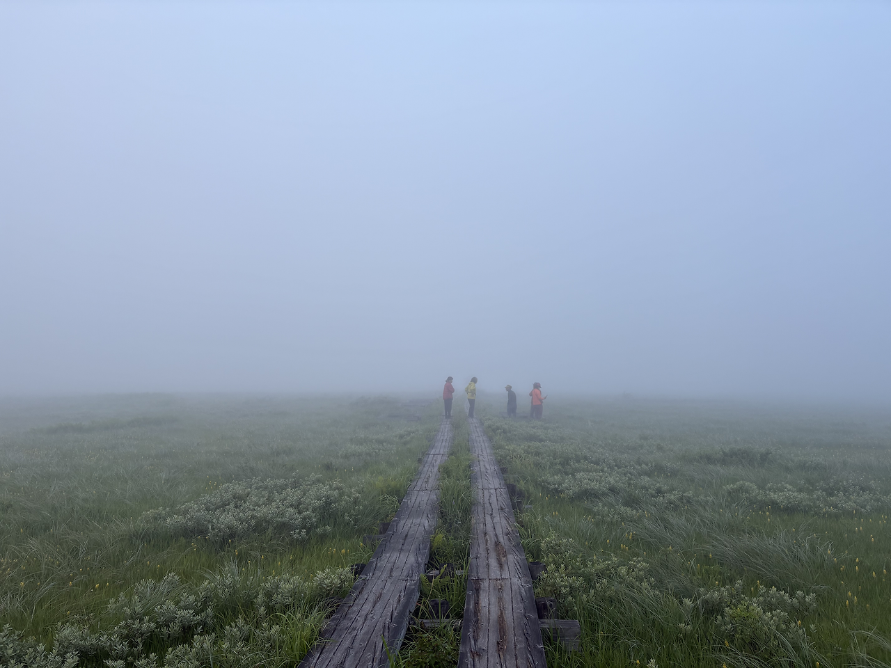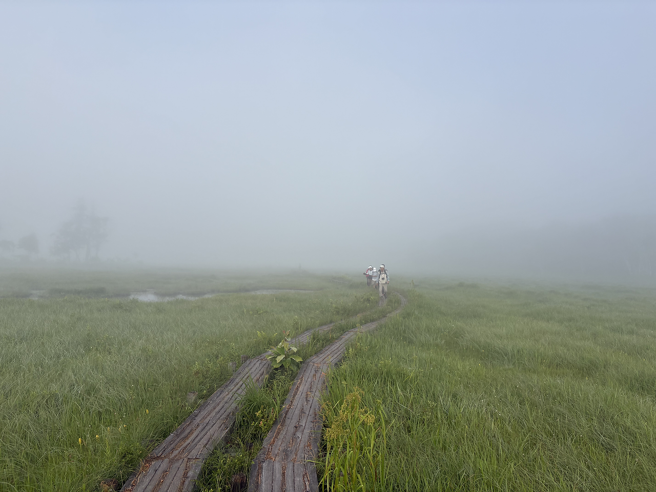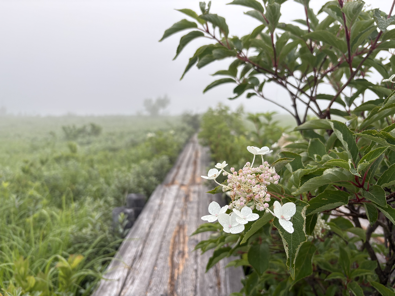 산장을 나와 2분쯤 걸었을까, 오제가하라의 목도(木道)가 시작되었다. 주변은 온통 안개에 잠겨, 10미터 앞도 제대로 보이지 않았다. 새벽잠이 없는 어르신 몇 분이 가벼운 차림으로 산책을 나선 모습을 빼면, 안개 낀 그 길 위엔 나 혼자 조용히 걷고 있었다. 뿌연 안개 너머의 풍경을 더듬듯 상상하다 보니, 앞이 보이지 않던 현실 속에서 막연한 불안을 품고 미래를 걱정하던 시절의 내 모습이 문득 떠올랐다. 생각해 보면, 안개는 결국 시간이 지나면 걷히는 법인데, 그땐 왜 그토록 노심초사했을까. 보이지 않아도 안개 너머 길은 분명히 이어지고 있었건만, 나는 그 사실을 믿지 못했다. 물론 지금도 불안은 여전하고 걱정은 하루도 쉬지 않지만, 이제는 안다. 잠시 앞이 흐리다고 해서 너무 조급해하지 않아도 된다는 것을.