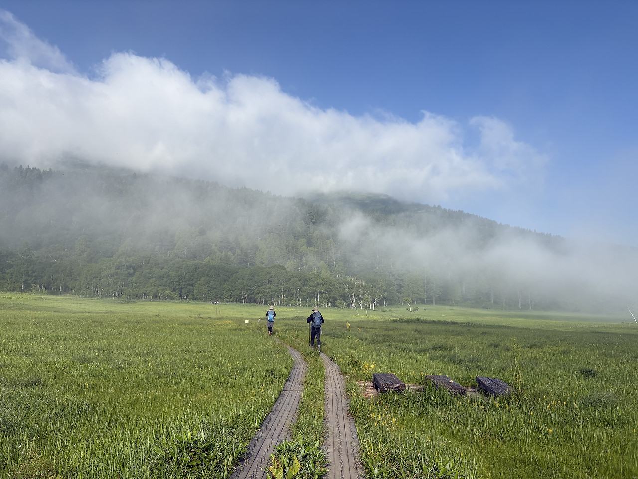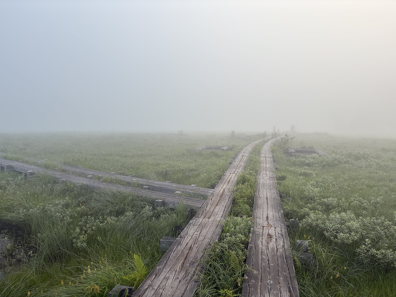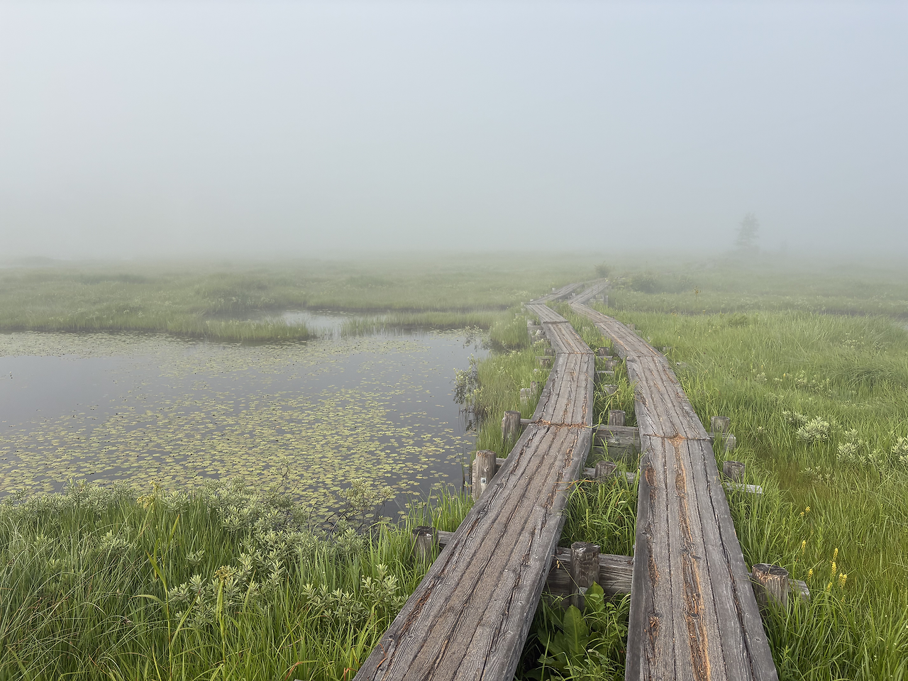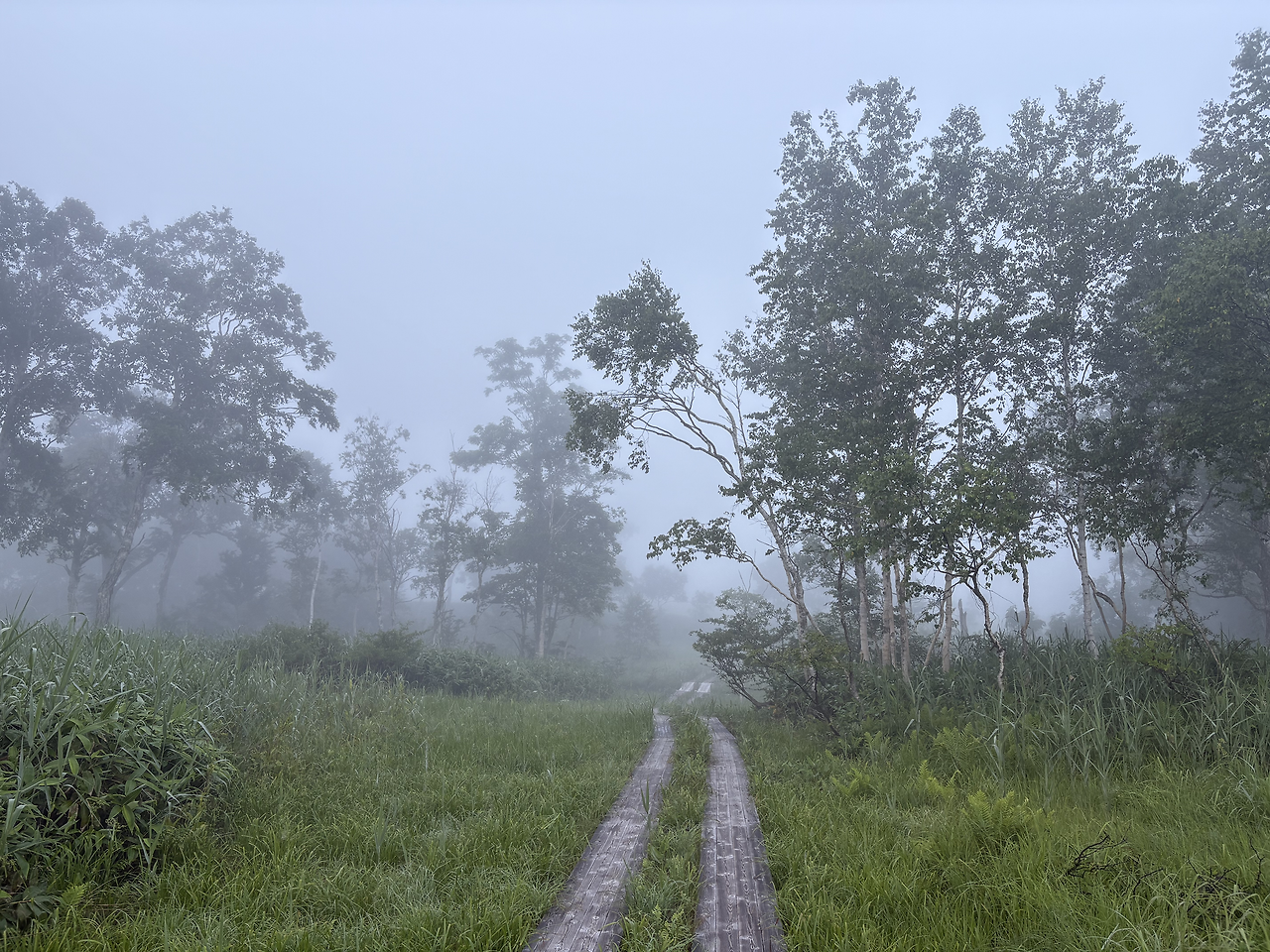 산장을 나와 2분쯤 걸었을까, 오제가하라의 목도(木道)가 시작되었다. 주변은 온통 안개에 잠겨, 10미터 앞도 제대로 보이지 않았다. 새벽잠이 없는 어르신 몇 분이 가벼운 차림으로 산책을 나선 모습을 빼면, 안개 낀 그 길 위엔 나 혼자 조용히 걷고 있었다. 뿌연 안개 너머의 풍경을 더듬듯 상상하다 보니, 앞이 보이지 않던 현실 속에서 막연한 불안을 품고 미래를 걱정하던 시절의 내 모습이 문득 떠올랐다. 생각해 보면, 안개는 결국 시간이 지나면 걷히는 법인데, 그땐 왜 그토록 노심초사했을까. 보이지 않아도 안개 너머 길은 분명히 이어지고 있었건만, 나는 그 사실을 믿지 못했다. 물론 지금도 불안은 여전하고 걱정은 하루도 쉬지 않지만, 이제는 안다. 잠시 앞이 흐리다고 해서 너무 조급해하지 않아도 된다는 것을.