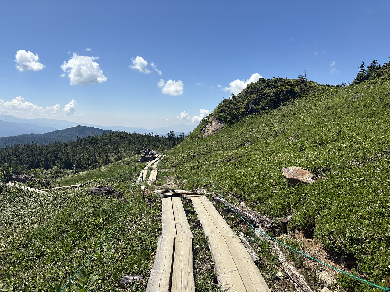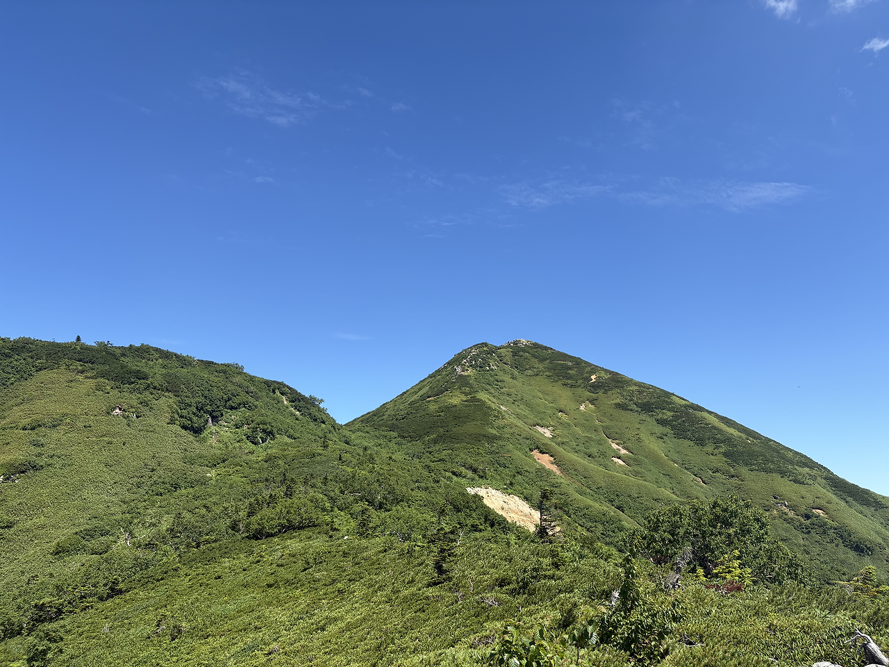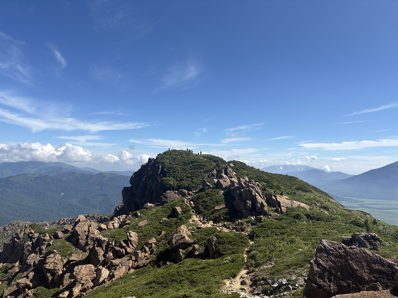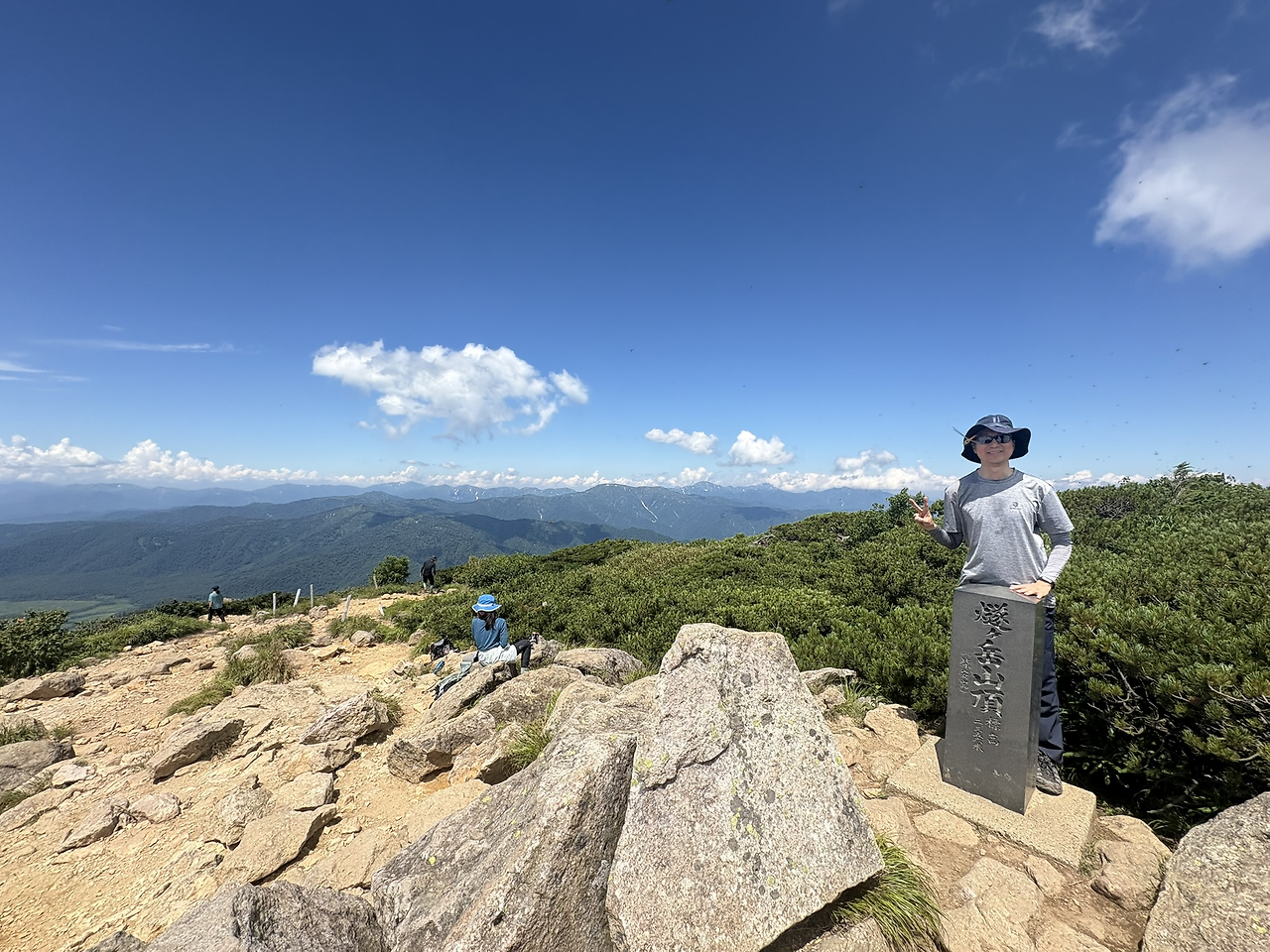 본격적으로 치고 올라가기 전에 이미 꽤 긴 거리를 걸으며 고도를 많이 높여놓은 상태라, 히우치가다케 정상에 오르는 길은 생각보다 그리 험하게 느껴지지 않았다. 가을에 다시 와도 좋겠다는 생각이 들었다. 정상인 시바야스구라(柴安嵓)는 온통 바위로 덮여 있었고, 그곳에서 인증샷을 남긴 뒤 1박 예정인 산장이 있는 미하라시(見晴) 방면으로 하산을 시작했다.