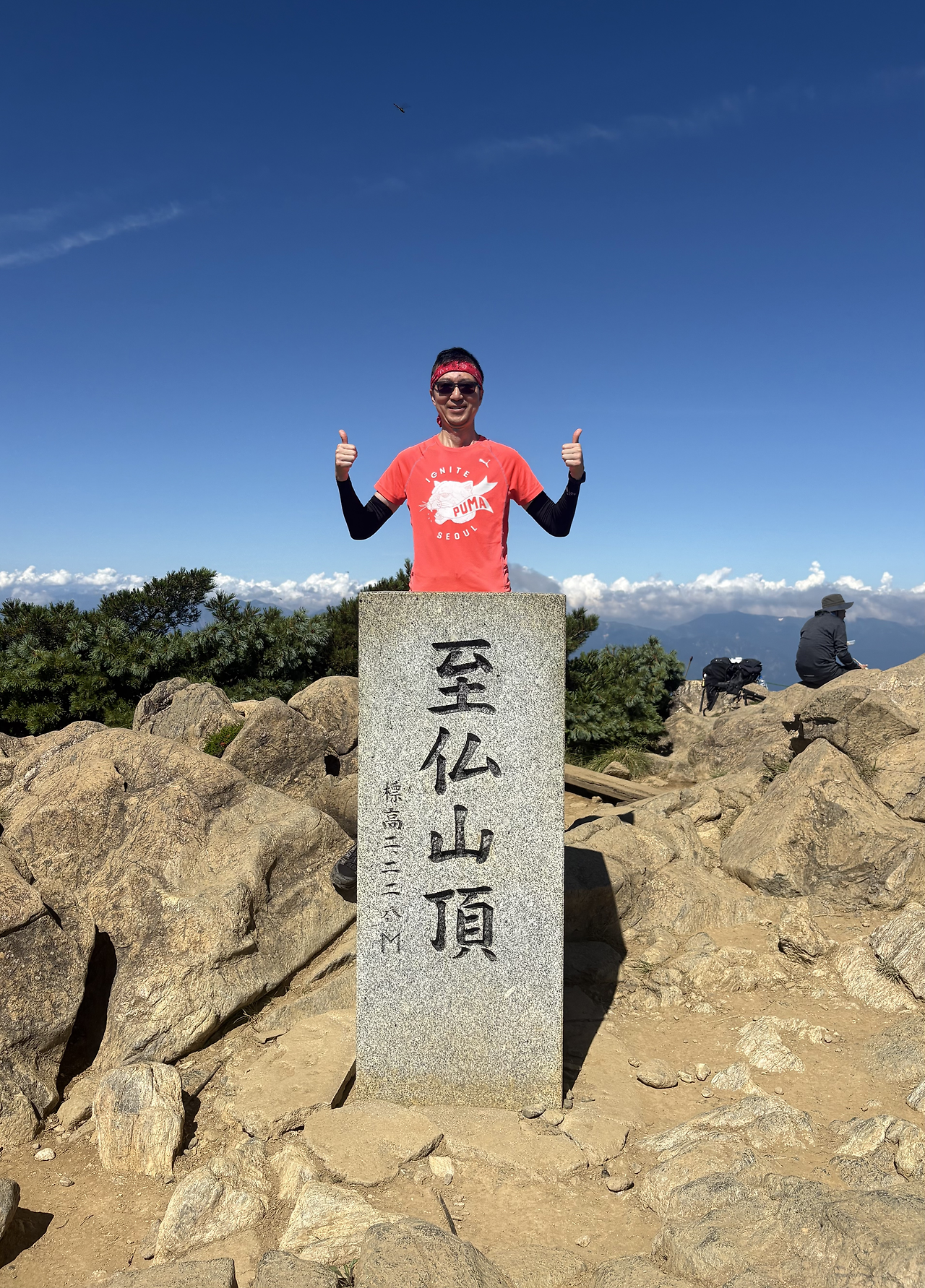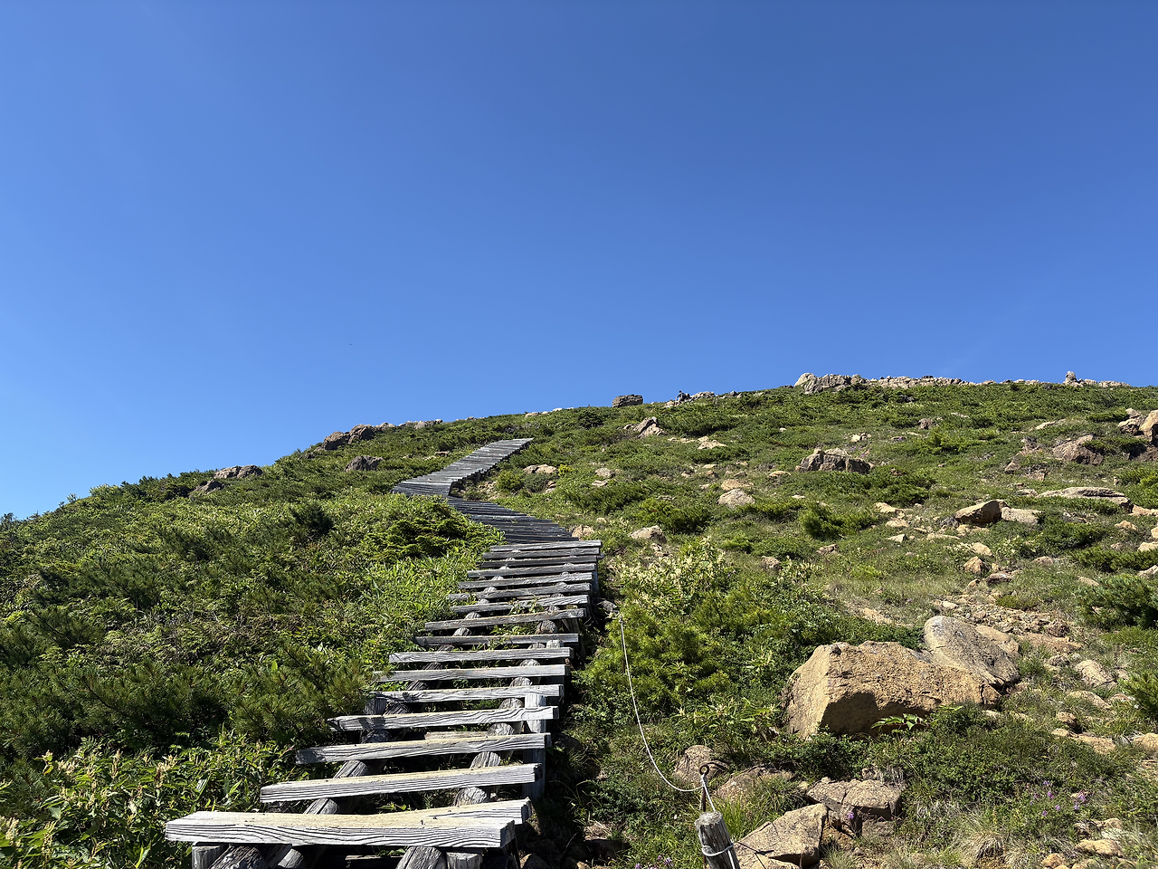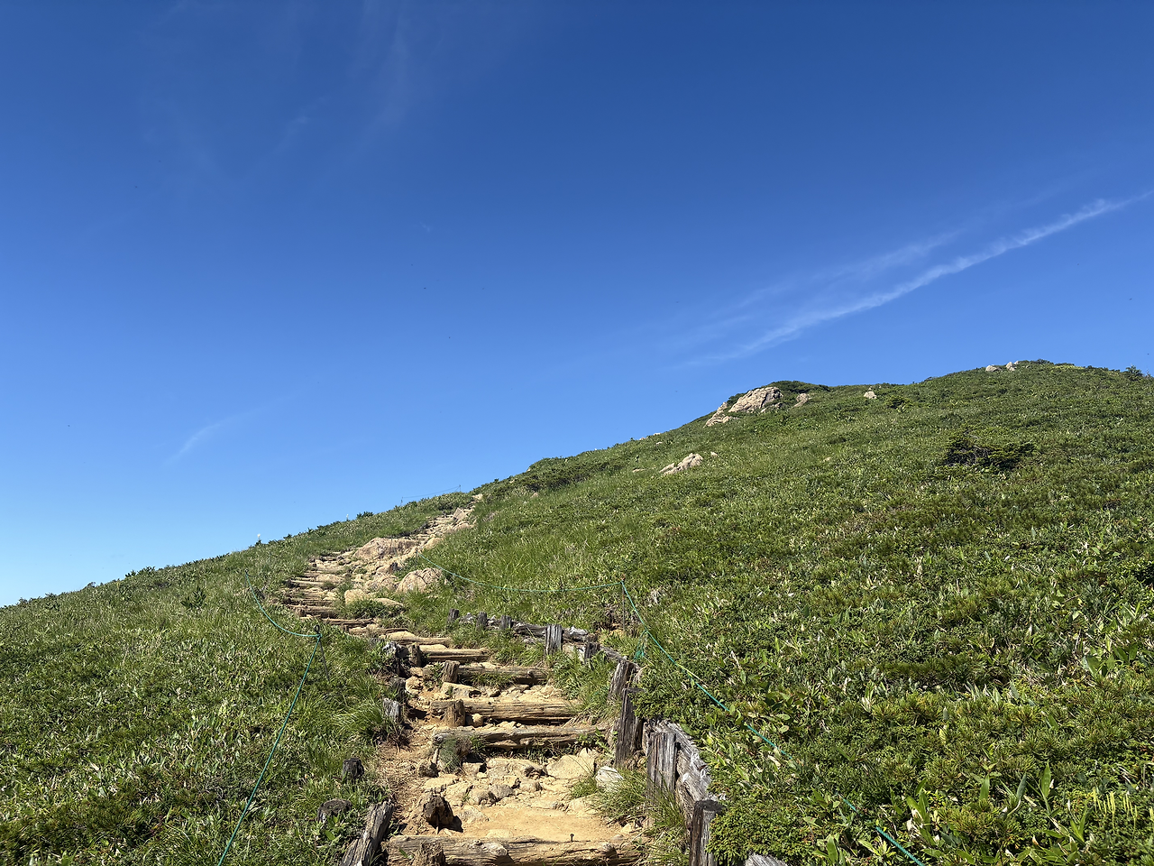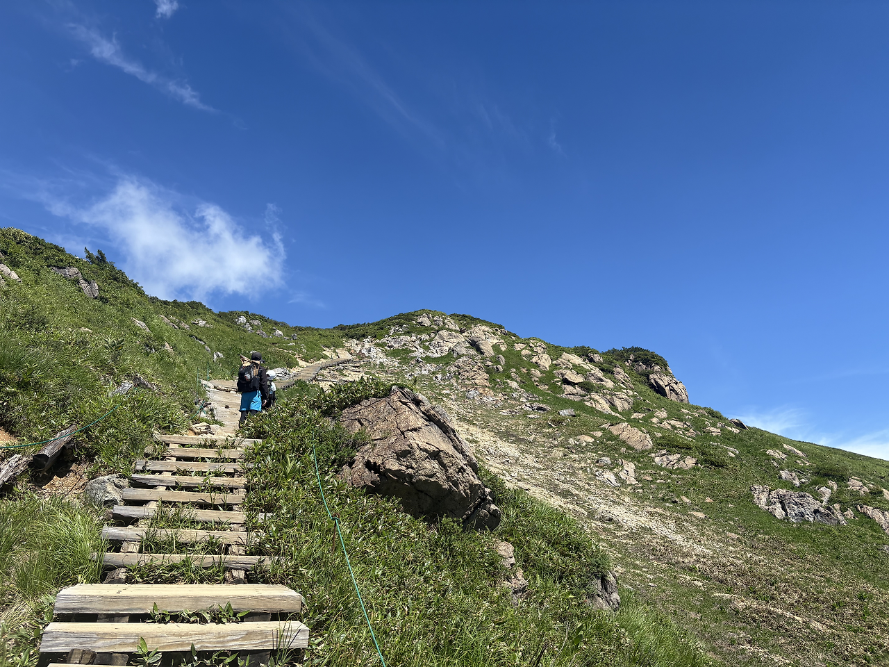 본격적으로 치고 올라가기 전에 이미 꽤 긴 거리를 걸으며 고도를 많이 높여놓은 상태라, 히우치가다케 정상에 오르는 길은 생각보다 그리 험하게 느껴지지 않았다. 가을에 다시 와도 좋겠다는 생각이 들었다. 정상인 시바야스구라(柴安嵓)는 온통 바위로 덮여 있었고, 그곳에서 인증샷을 남긴 뒤 1박 예정인 산장이 있는 미하라시(見晴) 방면으로 하산을 시작했다.