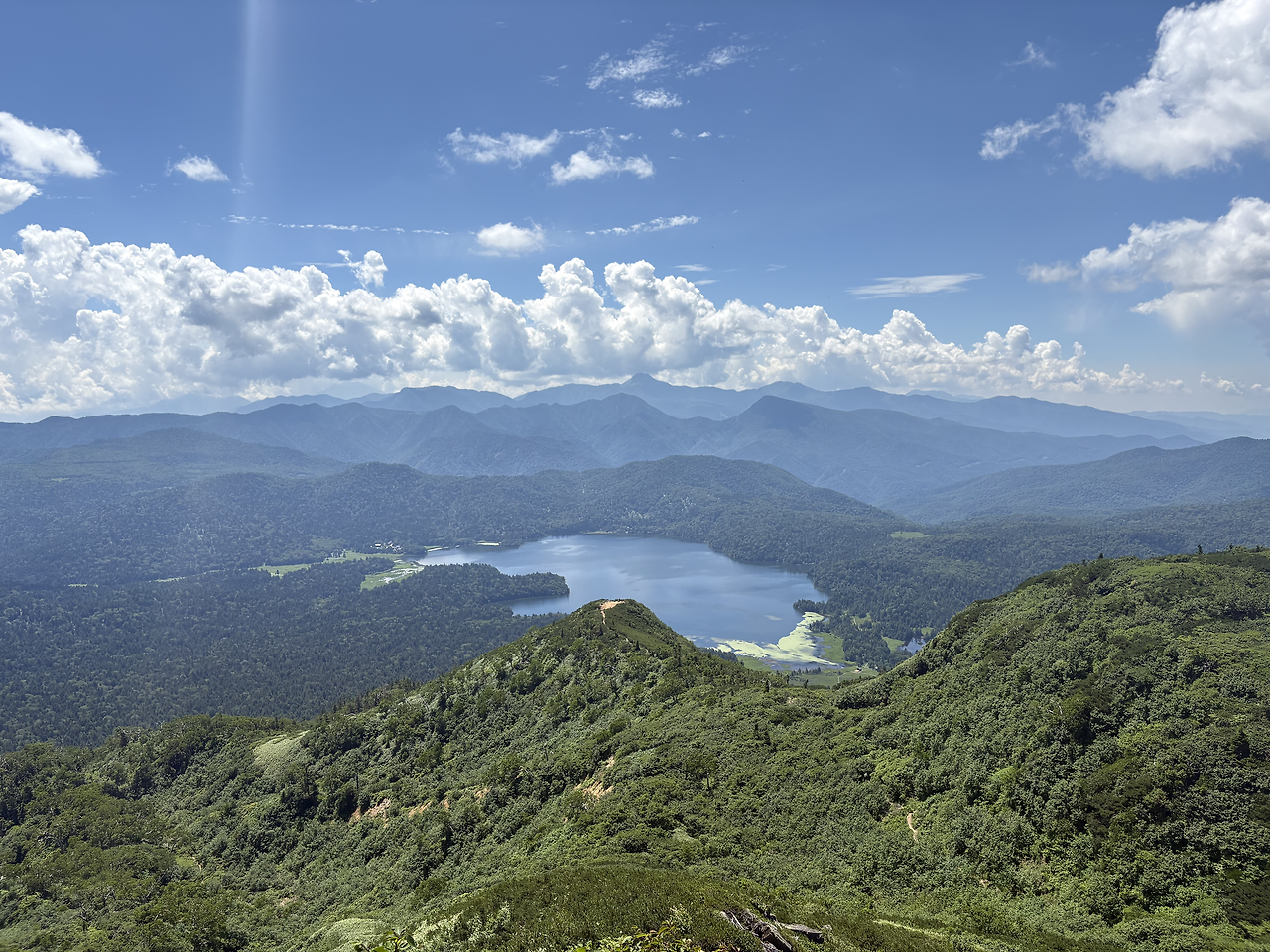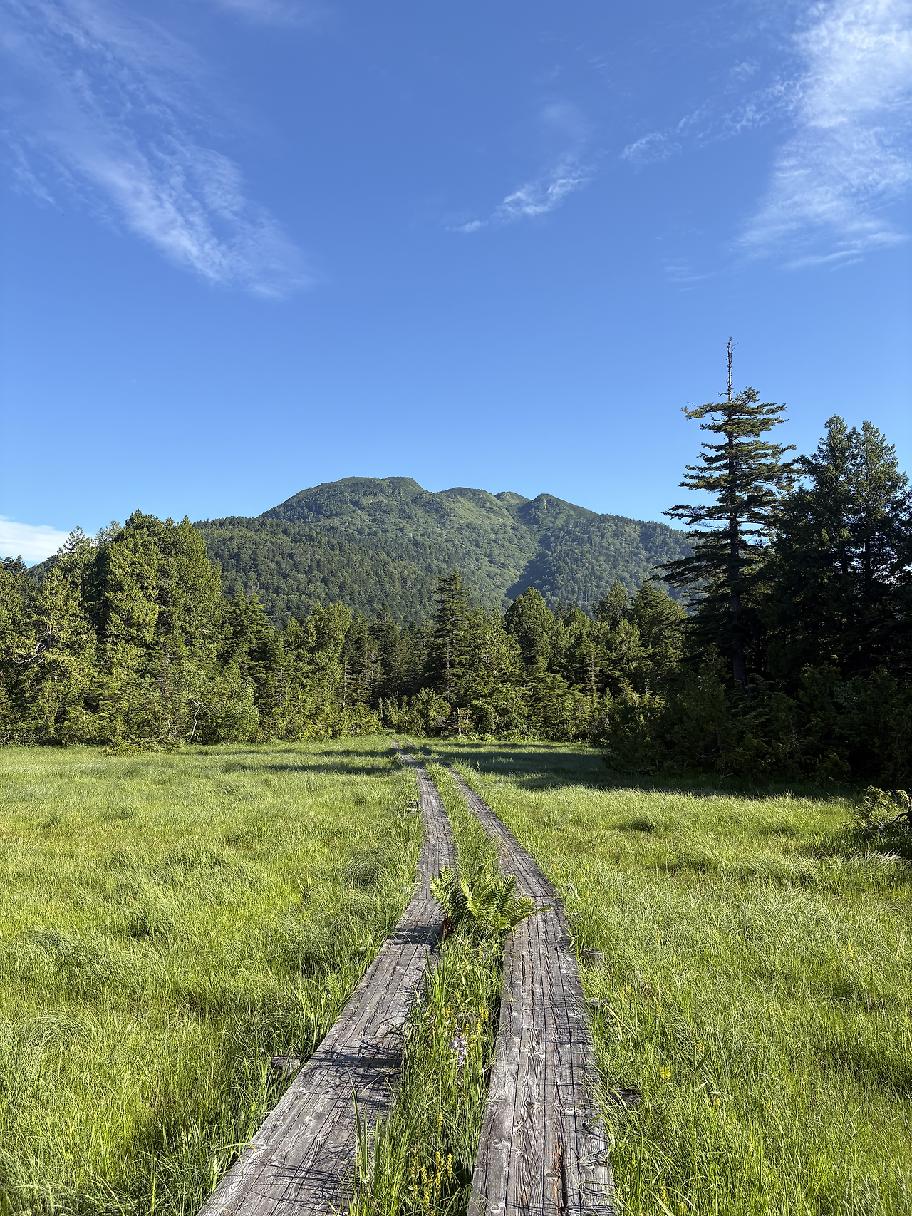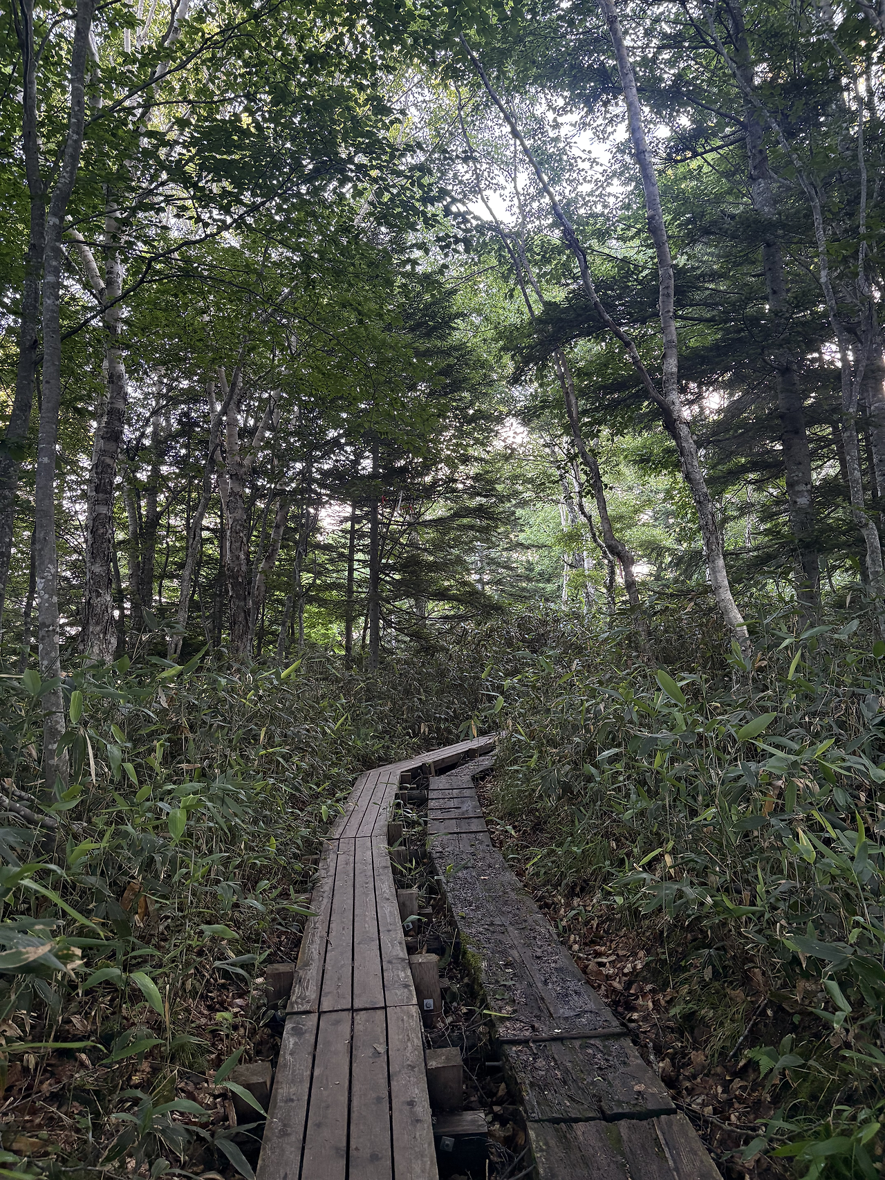 버스는 정확히 4:30 출발지인 오시미즈(大清水)에 정차했고 나를 포함 10여 명이 하차했다. 사실 여기부터 등산로입구까지는 유료 셔틀버스가 다닌다고 하는데, 시간표를 보니 첫차까지는 1시간이나 기다려야 했다. 거리가 3km 남짓이라 걸어가나 타고 가나 차이가 없을 것 같아 신발끈을 동여 메고 운동앱을 켜고 바로 산행을 개시했다. 조금 걷다 뒤를 돌아보니 아무도 나를 따라오고 있지 않았다. 해발 1200m 숲 길에는 두세 종류의 새소리와 희미하게 어디선가 들리는 계곡물소리만이 있었다. 그야말로 완벽한 고요 그 자체였다. 그렇게 완만한 산길을 따라 거의 15km 정도를 걸은 것 같다. 그사이 오니기리로 아침식사를 하며 잠깐 휴식을 취하기도 했지만, 크게 힘들지 않고 비교적 편하게 걸었다. 엄청 큰 저수지인 오제누마(尾瀬沼) 둘레길을 지나면서부터 푸른 하늘이 나왔다. 그리고 오늘 오를 산, 히우치가다케(燧ヶ岳, 2356m)가 성큼 내 앞에 다가와 있었다.
