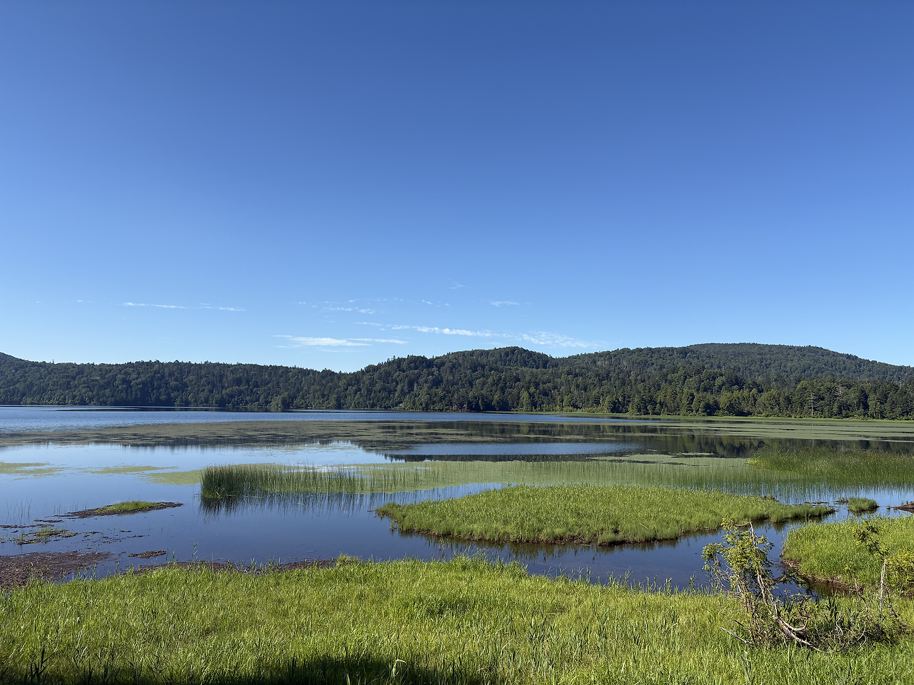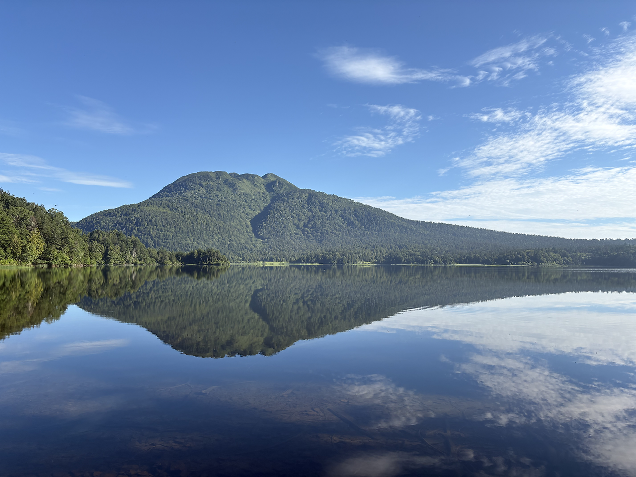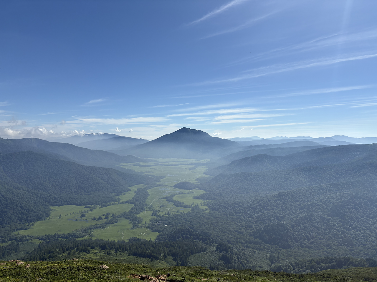 버스는 정확히 4:30 출발지인 오시미즈(大清水)에 정차했고 나를 포함 10여 명이 하차했다. 사실 여기부터 등산로입구까지는 유료 셔틀버스가 다닌다고 하는데, 시간표를 보니 첫차까지는 1시간이나 기다려야 했다. 거리가 3km 남짓이라 걸어가나 타고 가나 차이가 없을 것 같아 신발끈을 동여 메고 운동앱을 켜고 바로 산행을 개시했다. 조금 걷다 뒤를 돌아보니 아무도 나를 따라오고 있지 않았다. 해발 1200m 숲 길에는 두세 종류의 새소리와 희미하게 어디선가 들리는 계곡물소리만이 있었다. 그야말로 완벽한 고요 그 자체였다. 그렇게 완만한 산길을 따라 거의 15km 정도를 걸은 것 같다. 그사이 오니기리로 아침식사를 하며 잠깐 휴식을 취하기도 했지만, 크게 힘들지 않고 비교적 편하게 걸었다. 엄청 큰 저수지인 오제누마(尾瀬沼) 둘레길을 지나면서부터 푸른 하늘이 나왔다. 그리고 오늘 오를 산, 히우치가다케(燧ヶ岳, 2356m)가 성큼 내 앞에 다가와 있었다.