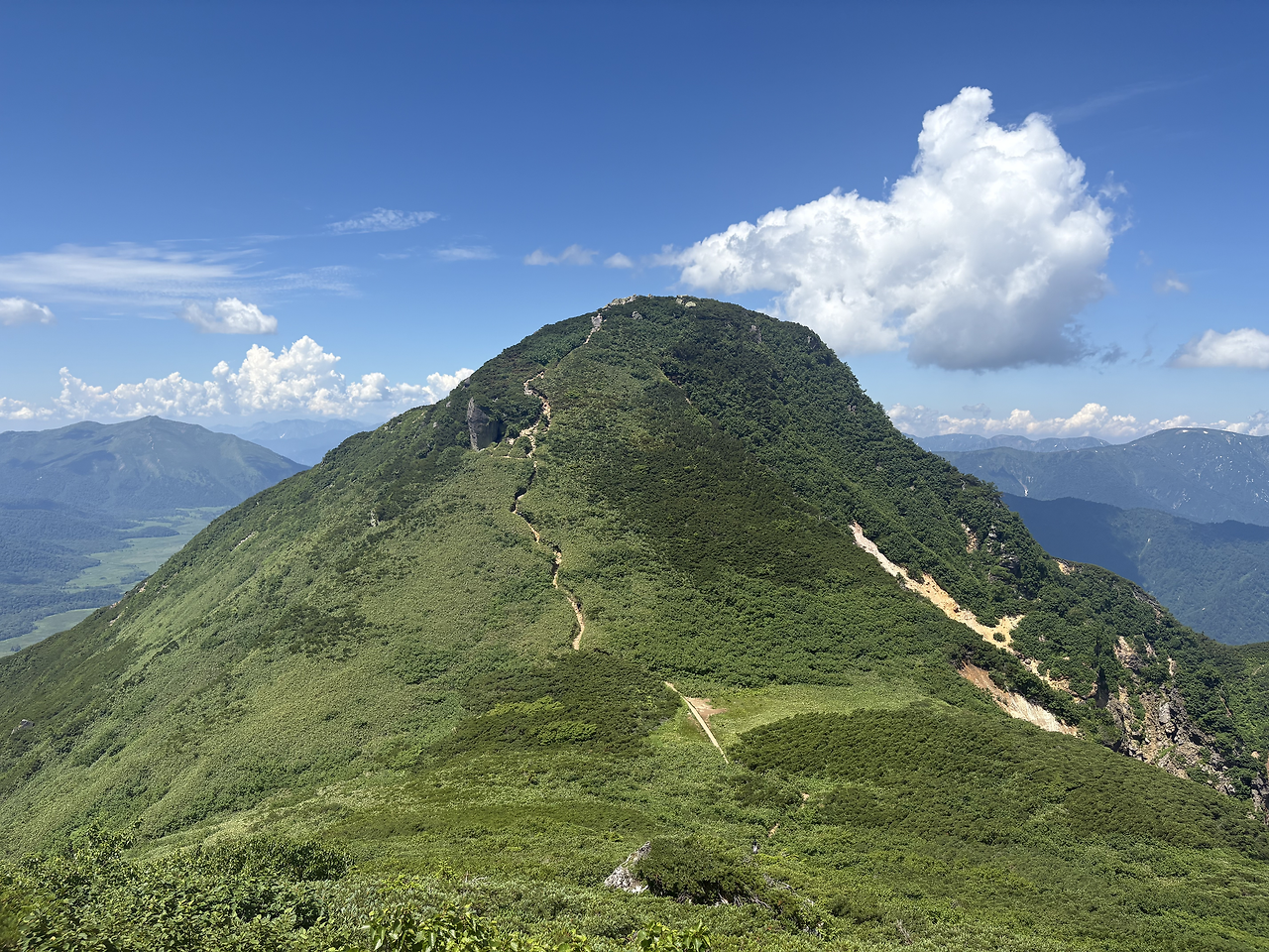 시부츠산 정상석은 등산로입구인 야마노하나(山の鼻)에서 800미터 정도의 고도를 치고 올라가야 도착할 수 있었다. 어제보다 몸 상태가 좋아서인지 등 뒤에 내리쬐는 햇볕을 피해 가며 2시간 정도만에 산정에 도착했다. 뒤를 돌아보니 저 멀리 어제 올랐던 히우치가다케가 웅장한 모습을 드러내고 있었다. 올라온 코스로는 하산이 불가해서 하산은 하토마치토게(鳩待峠)로 했다. 하산로는 완만하게 제법 긴 코스라서 이틀 연속 산행으로 지친 다리 근육의 부담을 오히려 덜어주었다.