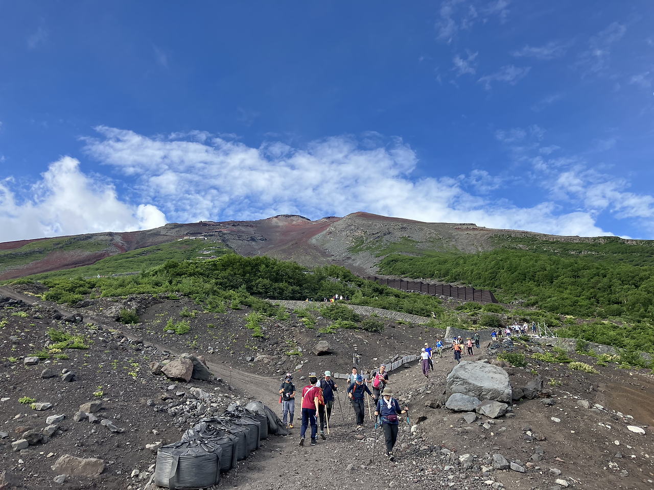 토요일 아침 가와구치코역에서 6시 30분에 출발하는 후지산고고메행 버스를 타고 해발 2304미터인 고고메에 내리니 대략 7시 20분 정도였다. 버스 타기 전에 아침끼니 포함해서 오니기리 3개 물 550ml 두 병, 간단한 행동식 등을 구입하고 왔기에 고고메에서는 화장실 들러 복장 정비하고 바로 출발했다. 걱정과는 달리 날씨가 좋아서 기분이 한껏 고양되었다. 올해부터 고고메서 출발하는 요시다루트의 경우 사전에 후지산 등반에 대한 유료 예약이 필요해서 그런지 외국인의 비중은 증가한 것처럼 보였으나 전체 산행객은 오히려 줄어든 느낌이었다.