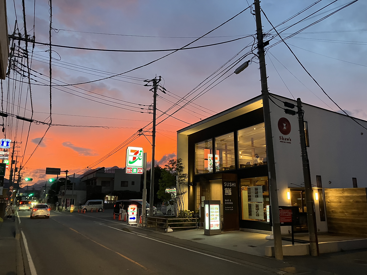 배부르게 먹고 나서는 그야말로 미친 듯이 하산을 하기 시작했다. 자갈 섞인 모래사막을 미끄러지듯이 내려왔다. 스틱에 의지하여 무릎에 무리를 최소화하며 3시간 정도만에 고고메로 돌아오게 되었다. 거의 다 내려오니 당초 일기예보대로 비가 쏟아지기 시작했다. 땀과 먼지로 범벅이 된 상태에서 내리던 시원한 여름비가 어찌나 반갑던지. 다시 가와구치코역으로 돌아오는 버스를 타고 정류장에 내리니 신주쿠로 돌아가기 위한 버스 시간까지 1시간 반이상 남아 있었다. 역 앞의 한 호텔에서 운영하는 목욕탕에서 씻고 옷을 갈아입은 후, 맥주 한잔 곁들여 저녁을 먹고 나오니 터질 것 같은 붉은 노을이 작별 인사를 하고 있었다. 도쿄에서 좀처럼 이런 멋진 노을 보기 힘든데, 오늘은 여러모로 완벽한 날이었다. 다치지 않고 무사히 하산한 고마움, 살아있다는 기쁨과 가족에 대한 그리움으로 충만한 하루였다.