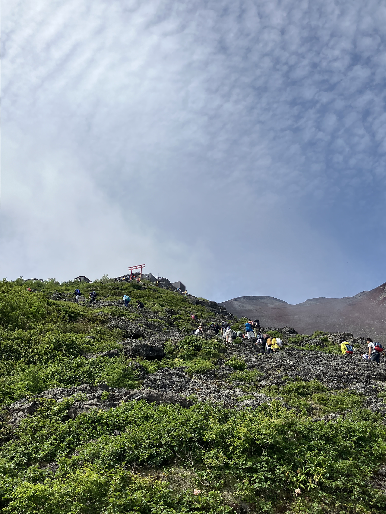 흙길에서 돌산으로 바뀌고 조금씩 경사도 급해지기 시작했다. 보통은 산행 시 팟캐스트를 듣곤 하지만 이날은 핸드폰 배터리를 조금이라도 아끼려다 보니 오히려 온전히 산행에 집중할 수 있었다. 생각을 덜어내고 또 생각을 정리하며 한 걸음 한 걸음 소리 없이 나와 대화를 하며 그렇게 고도를 계속 높여나갔다. 저 멀리 보이는 산장이 나중에 알고 보니 나나고메(七合目) 지점이었다. 아직까지는 호흡도 체력도 전혀 어려움이 느껴지지 않았다. 순간순간이 참 다행이고 고맙게 느껴졌다.
