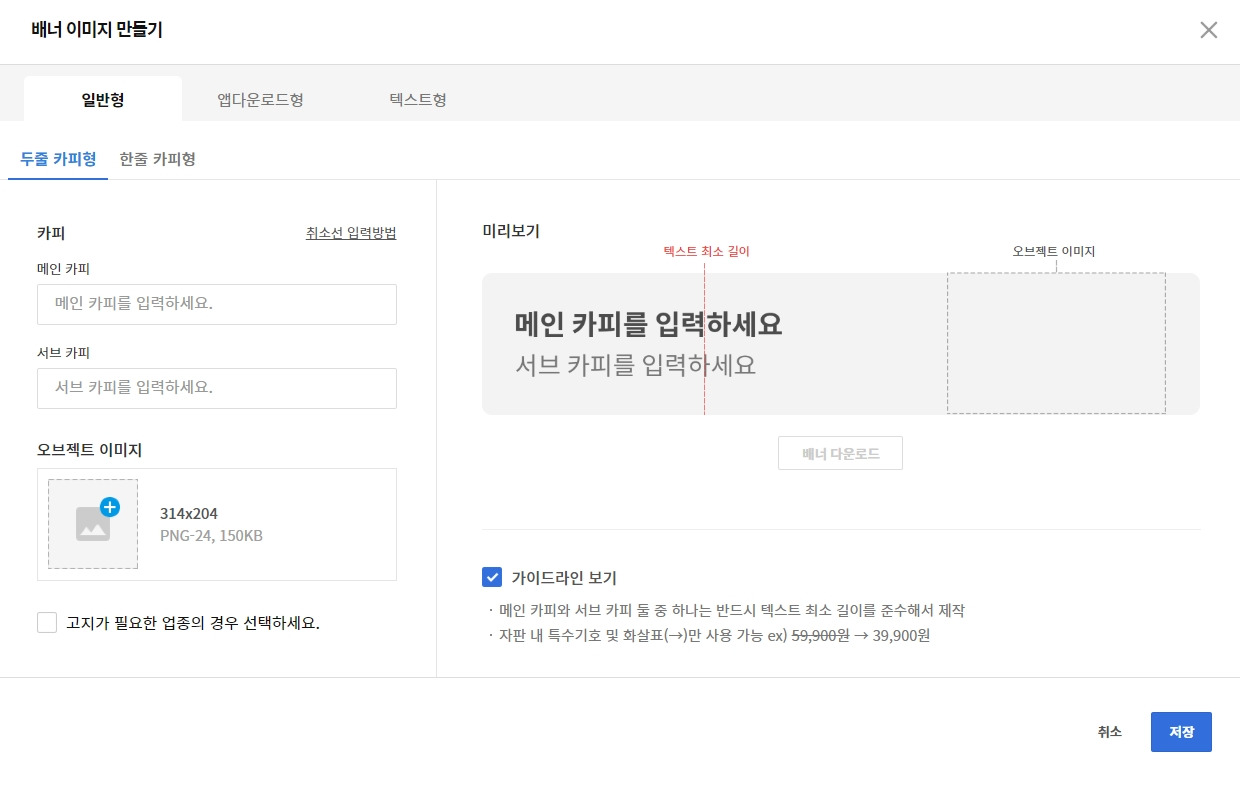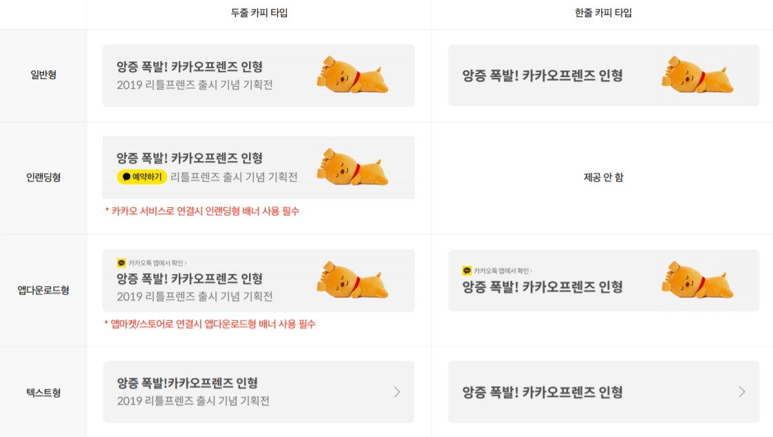 위의 이미지는 배너 이미지를 만드는 화면을 캡쳐한 것인데요. 형태는 일반형/인랜딩형(카카오 서비스로 랜딩 시)/앱 다운로드형(앱마켓/스토어로 랜딩 시)/텍스트형이 있고요. 여기서 한줄 카피 타입 보다는 최대한 많은 소구 포인트를 나타낼 수 있는 두줄 카피 타입을 추천합니다.