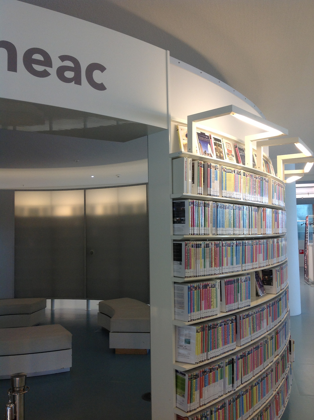 사방은 유리창으로 되어 있어 자연채광으로 인해 밝고 힘찬 분위기가 몸에 배어 든다. 게다가 건물 내부는 전체적으로 깔끔한 하얀색으로 칠해져 있고 군데군데 포인트 색상으로 변화를 주었다. 도서관 중앙에는 위층으로 올라가는 에스컬레이터가 있다. 거대한 쇼핑몰 같은 곳에 온 느낌.
