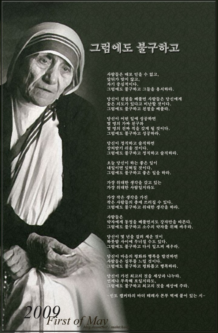 엄마는 기아, 난민, 장애인들에 관심이 많았어. 처음엔 그저 단순한 관심, 그들이 불쌍하다, 이 정도였단다