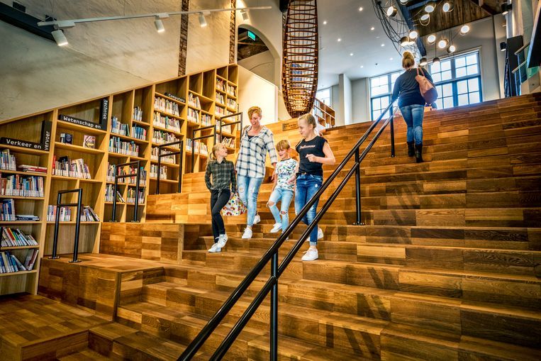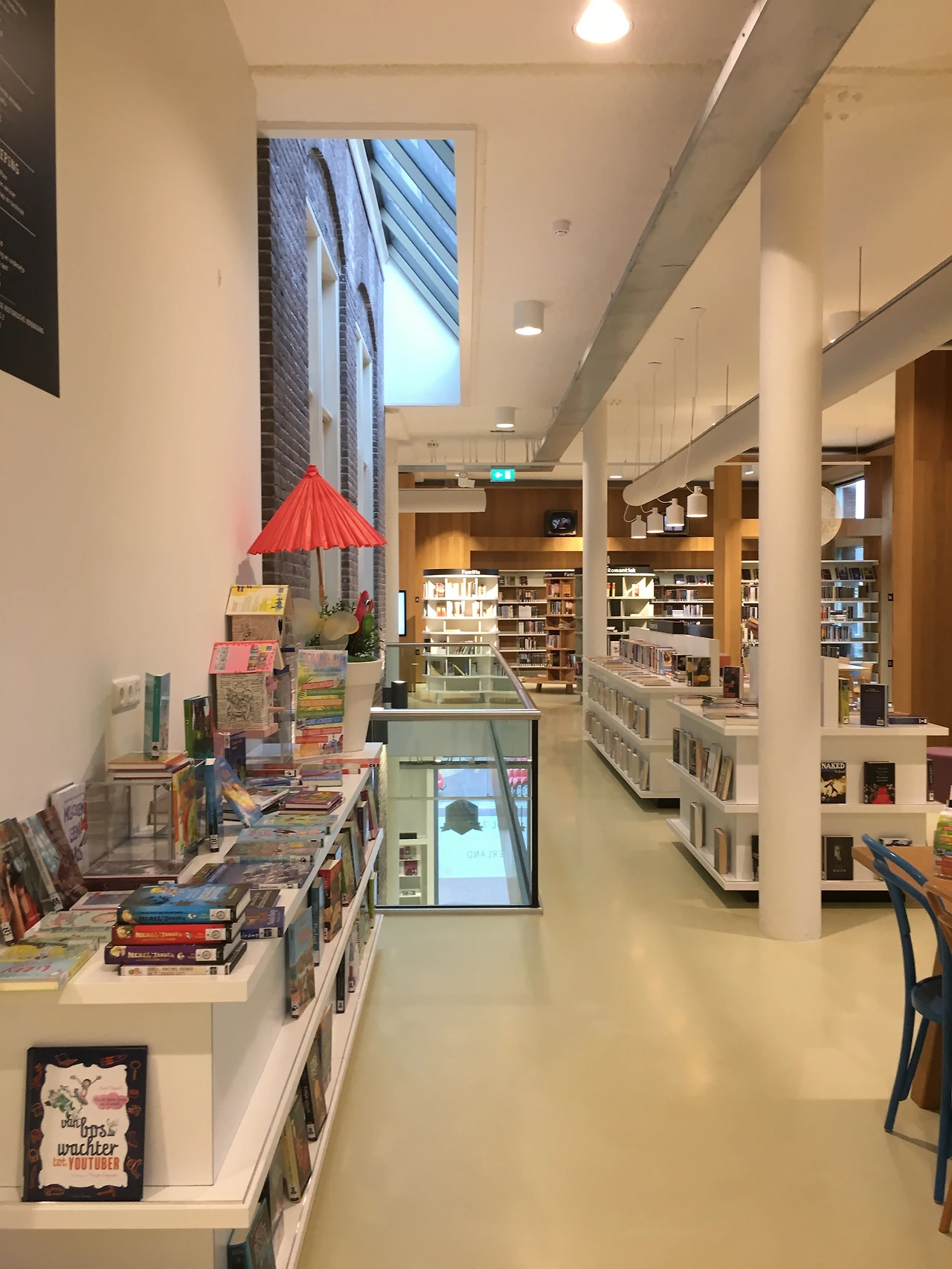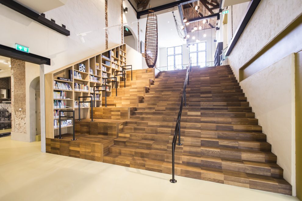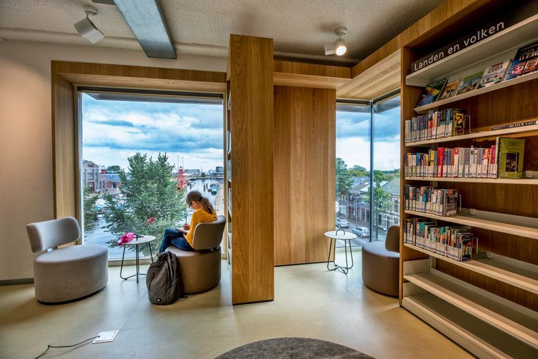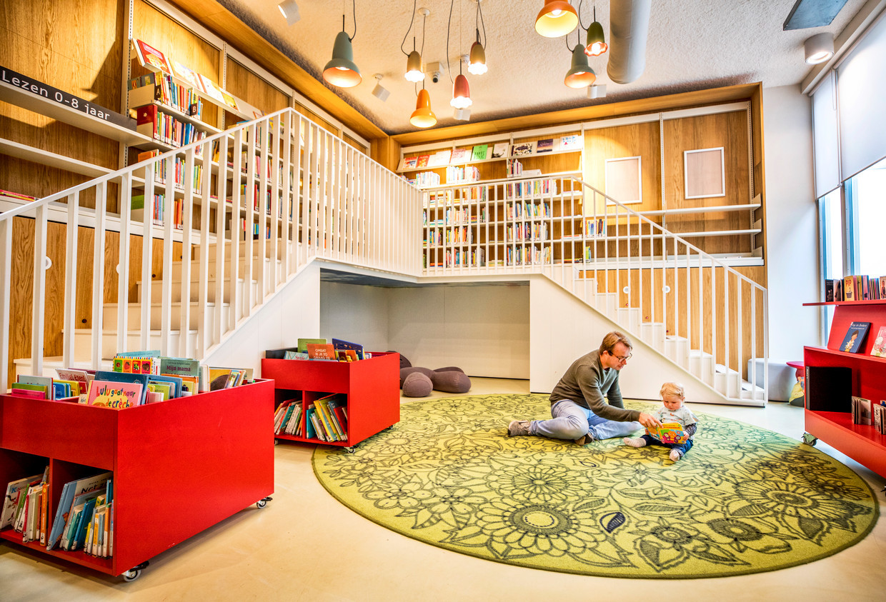 건축가 에이블린 판 베인(Evelien van veen)과 디자이너 마르셀 판 더 비어(Marcel van der veer)의 협작품이 새로운 학교 7 도서관인 것이다. 이들은 오래된 학교의 모습을 보존하면서도 공공 도서관이 갖추어야 할 요소를 새 건물 속에 구현해낸다. 두 건축가와 디자이너는 아름다운 영상에 매료된다. 일생동안 책을 돌보다가 인생 말년에 책들의 돌봄을 받는 감동적인 모리스 레스모어에 관한 짧은 영화(모리스 레스모어의 환상적인 날아다니는 책)를 보고 영감을 얻어 도서관을 새롭게 디자인하여 짓는다. 그들은 도서관은 더 이상 책을 빌리는 장소가 아니며 새로 온 사람들을 위한 언어 카페이자 나이 든 사람들이 아이패드를 들고 마실 나올 수 있는 곳이어야 한다고 생각한다. 그래서였을까? 학교의 옛 건물과 새롭게 이어 건축한 건물은 복도와 계단으로 연결되어 있다. 1층 로비는 그야말로 전망 좋은 거실이다. 항구와 해양테마파크와 영화관이 보이는 길목에 위치하기에 더욱 그렇다.