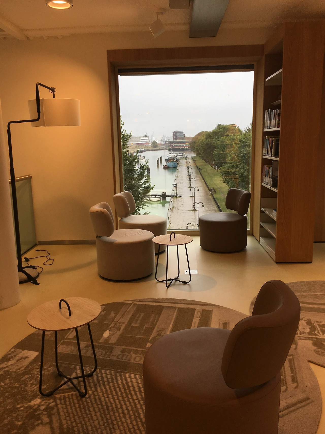 도서관이지만 이 도서관의 모토인 '도시의 거실'처럼 음향기기와 분위기 있는 인테리어, 사색하기 좋은 분위기의 흔들의자, 아늑한 분위기를 만들어 주는 조명, 그리고 햇빛이 마음껏 들어올 수 있는 커다란 창문.