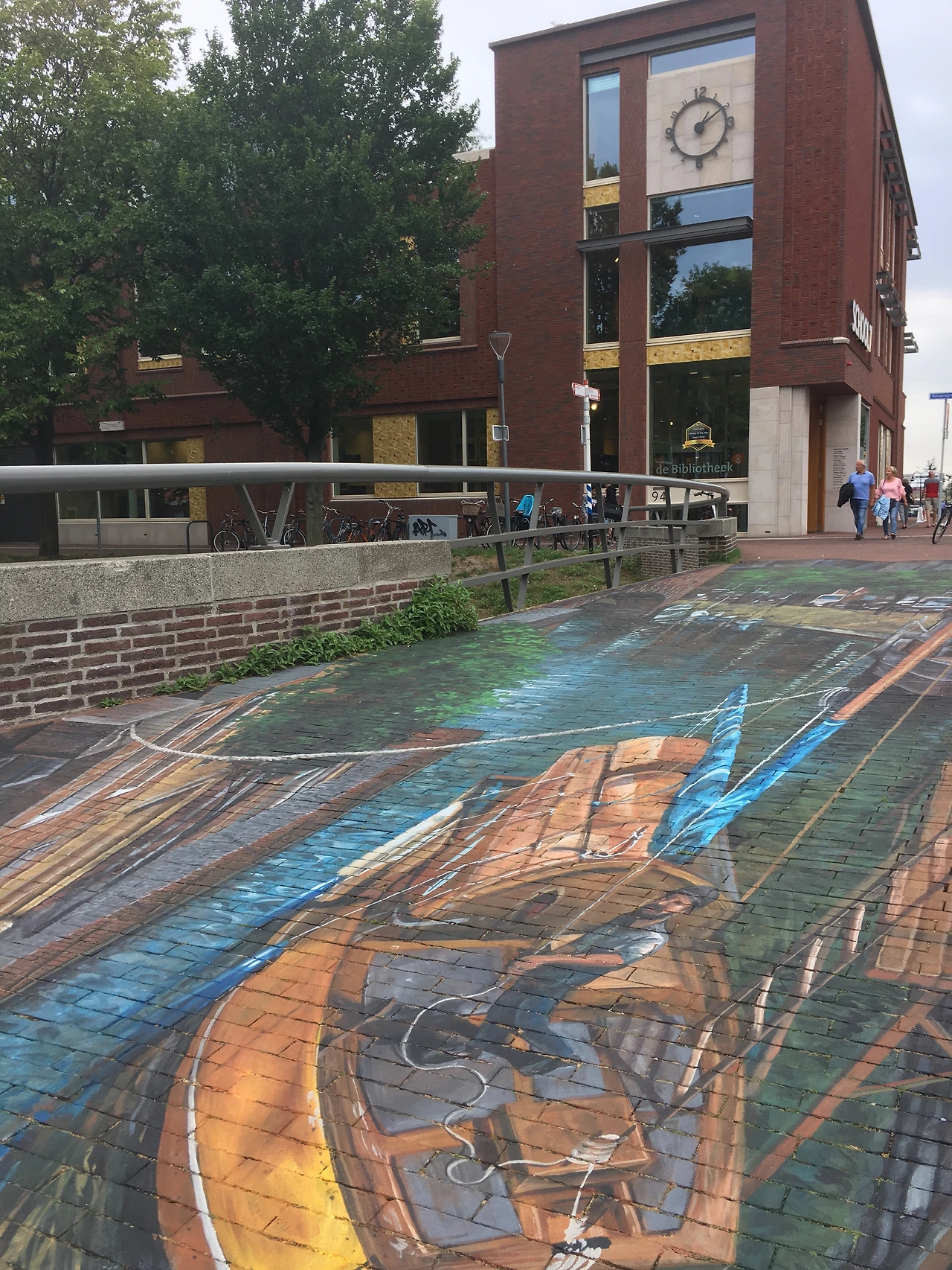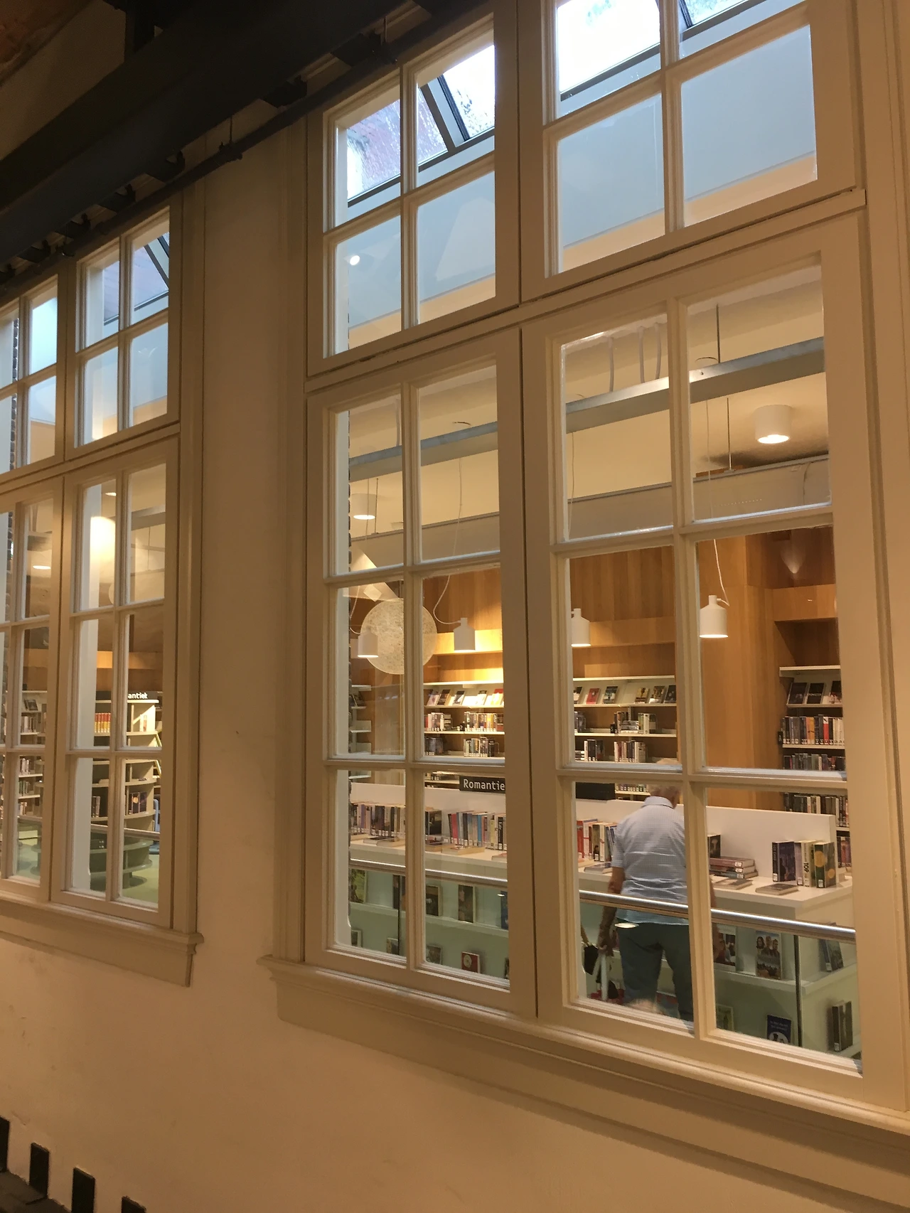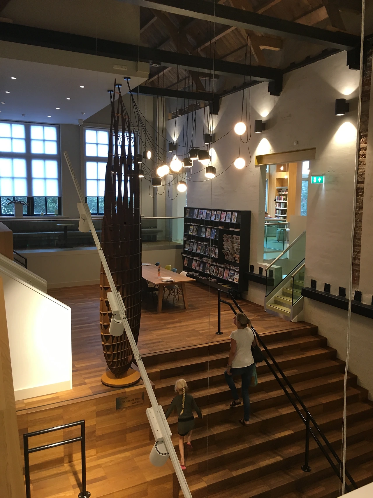 나와 셋째, 막내딸은 도서관에 들어가기 전부터 이 그림 앞에서 한동안 놀았다. 운하를 가로지르는 다리 위에 그려진 그림이라 근경을 앞세운 원경이 펼쳐지는 운하를 배경으로 사진도 찍고 나룻배가 그려진 길바닥 그림 위에서 수다를 떨기도 했다. 도서관 들어가기까지의 시간을 즐긴다. 로비에 들어서자마자 독특한 반개방 공간을 보고 그저 이쁘다 멋있다란 말만 내뱉었다. 빨리 가서 그 공간을 구경하고 싶은 마음이 크게 작용하는 만큼 뒤로 내빼서 천천히 조심스럽게 다가가고 싶은 역작용이 동시에 이루어지는 그 흥분감을 무엇이라 표현할까?