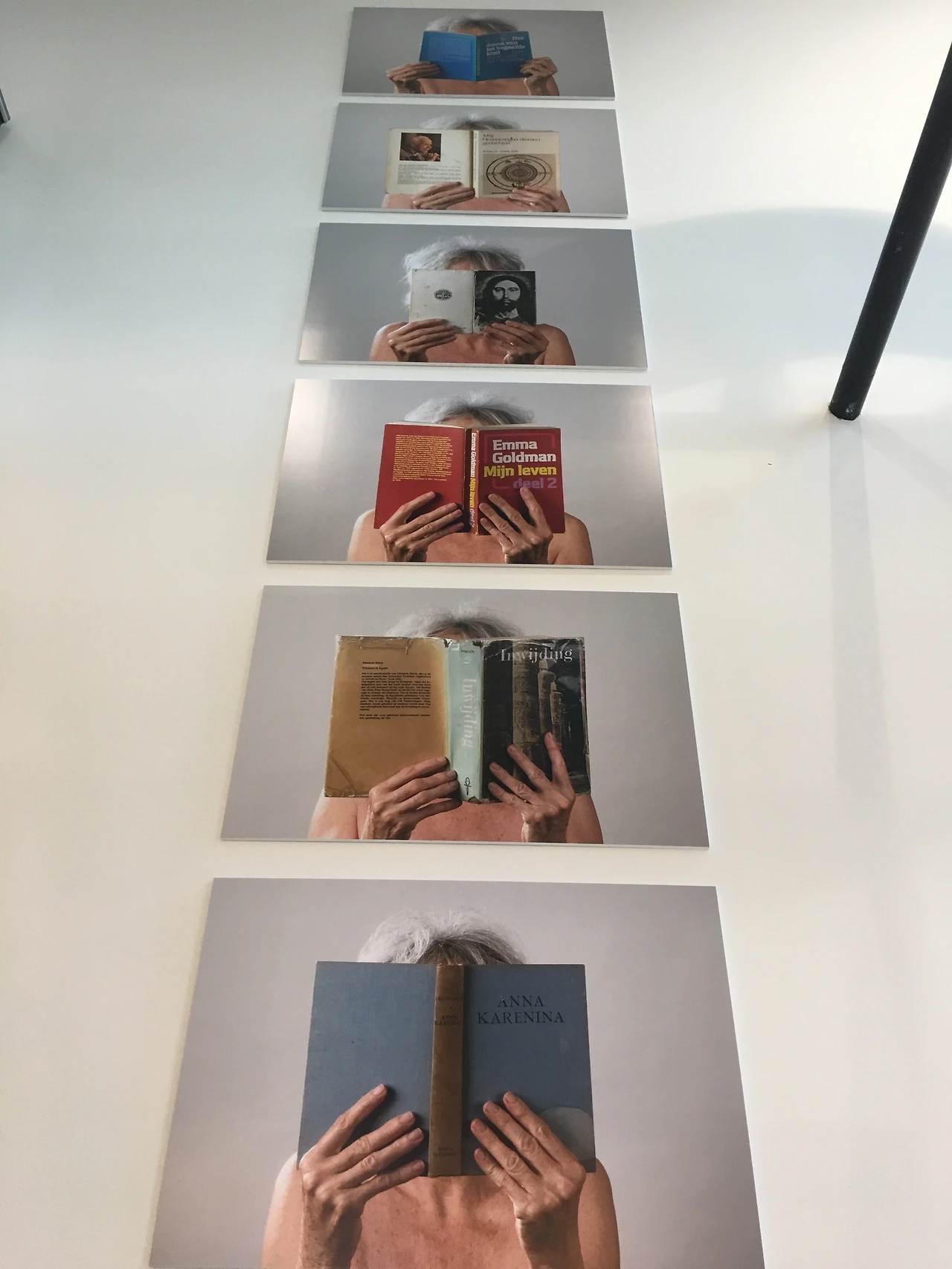 계단 벽면에는 산뜻한 책꽂이가 있어 운치 있는 책 벽장이 된다. 계단 하나하나 오르다가 끝까지 오르면 조각품 같은 등이 있어 은은한 조명의 근원지가 이것이구나를 인정하게 된다. 더 올라가면 차를 마실 수 있는 카페 공간이 나온다. 도서관이 아니라 앤틱 카페다. 거기서 차 한 잔 마시며 내려다보는 것도 상당히 분위기 있을 것 같다. 계단 끝에서 오른쪽으로 가든지 왼쪽으로 가든지. ㅁ자 모양의 구조라서 어느 곳에서 출발하든 한 바퀴 돌다 보면 어느새 도서관 일주를 하게 되어 있다. 그리고 1층부터 꼭대기 층까지 통째로 이어진 벽면에는 할아버지가 책을 읽는 사진이 세로로 붙인 띠벽지처럼 부착되어 있다. 정말 대단한 작품이다라는 생각을 했다. 동일한 할아버지가 다른 책을 펼치고 있는 모습이.