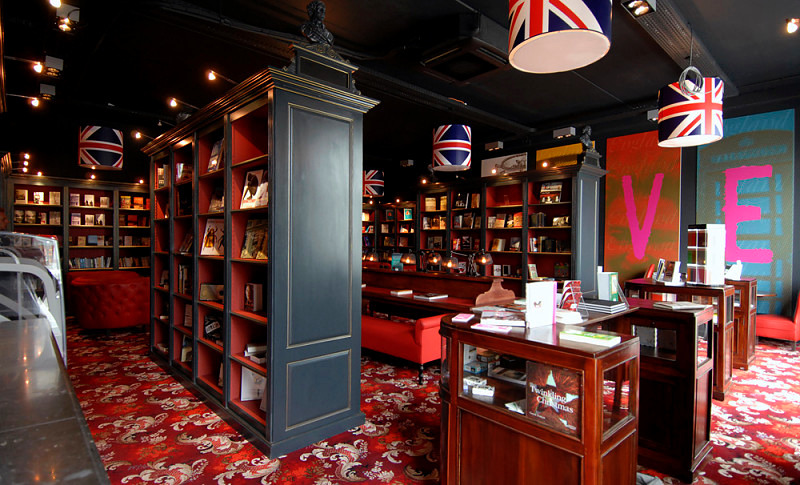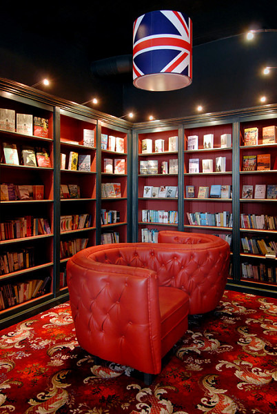 영어서적 섹션 - 영국을 상징하는 차와 붉은 양탄자와 국기로 데코 한 것이 특징이다