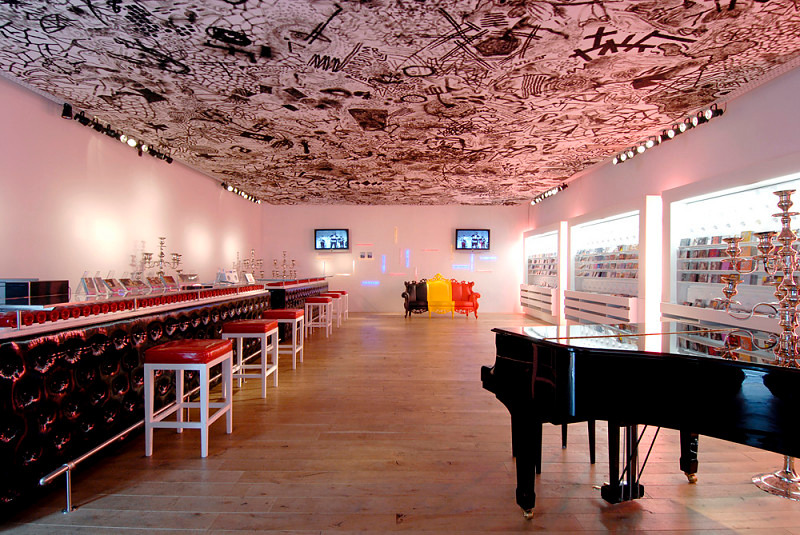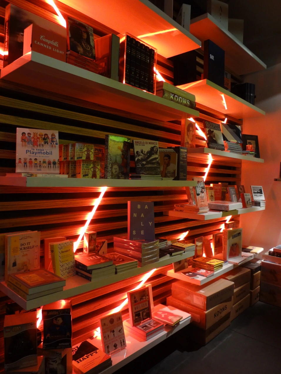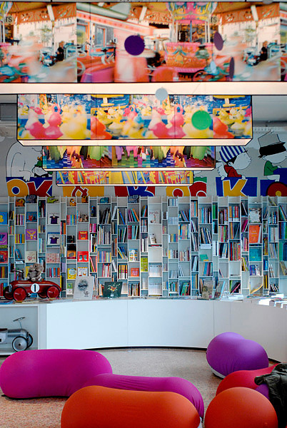 - 예술 섹션 - 빨간색 네온 색상의 책꽂이와 연두색 큐브가 눈에 띈다 -