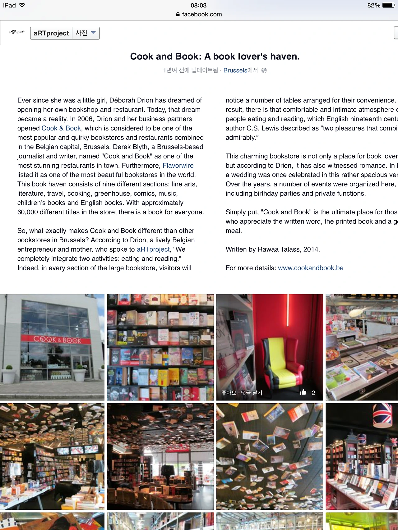 벨기에의 한 여성 데보라 드라이온(Debora Drion)은 어린 시절부터 레스토랑과 서점을 한 공간에 마련하여 운영하는 것이 꿈이었다고 한다. 그 꿈을 펼치기 위해 남편과 함께 모든 자금을 모아 브뤼셀(Brussel) 외곽에 쿡앤북(cook & book) 서점을 만들었다. 우리나라 사람이라면 쉽게 시도하지 못했을 꿈이다. 남편의 전직이 변호사였으니 말이다. 어린 시절의 꿈이 그대로 현실이 되었다고 단순하게 말하기에는 부족하다. 그동안의 숨은 노력과 이 꿈을 지지해주는 사회적 분위기와 주변 사람들의 인식 그리고 본인의 가치관과 새로운 시대를 펼칠 수 있도록 기능적 역할을 하는 가치관이 진심으로 부러울 뿐이다.