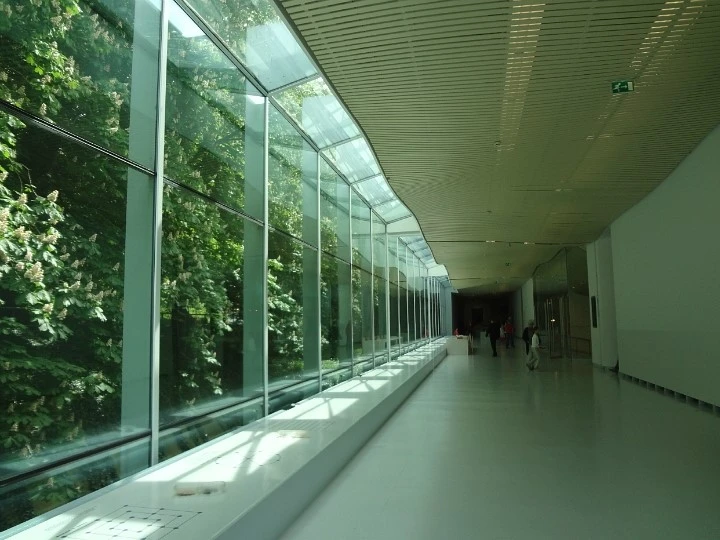 처음 이 미술관에 도착하여 밖에서 바라볼 땐 그저 단순해 보이고 푸른색을 띤 네모난 상자 몇 개 얹은 듯해 보였으나 입구로 들어서자마자 탄성을 지르게 되었단다. 천정에는 파도가 치고 창 밖에는 푸른빛이 넘실대고 벽 한 면이 통째로 숲 속인 것 같은 이는 필시 자연을 담은 미술관이었다.
