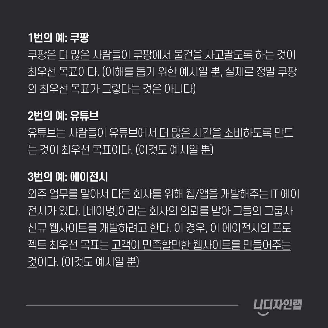 3번의 예시로는 에이전시를 들 수 있다. 외주 업무를 맡아서 다른 회사를 위해 웹/앱을 개발해주는 IT 에이전시가 있다. [네이벙]이라는 회사의 의뢰를 받아 그들의 그룹사 신규 웹사이트를 개발하려고 한다. 이 경우, 이 에이전시의 본 프로젝트 최우선 목표는 니디자인랩이라는 고객이 만족할만한 웹사이트를 만들어주는 것이다. (마찬가지로 예시일 뿐이다)