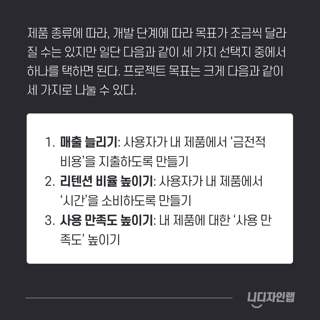 당연히 프로젝트 시작하자마자 맨 처음 목표 설정을 해야 한다. 내가 지금 참여하는 프로젝트 또는 제품/서비스의 목표가 위의 세 가지 중 어디에 해당하는지 파악하자.
