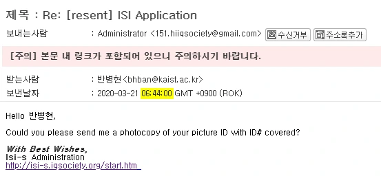 ISI의 신속한 답장 하나 또 의도치 않게 마음에 드는 점이 있는데, ISI 운영진이 사는 곳과 대한민국은 적당한 시차가 있다는 점이다. 퇴근 후에 이메일을 보내 놓으면 아침에 눈을 뜨자마자 답장을 확인할 수 있는 구조다. 오래 기다렸다는 느낌을 전혀 받지 않고 절차를 마무리할 수 있었다. 가입을 위해 이런저런 연락과 서류를 주고 받았는데 이를 요약하면 아래와 같다.