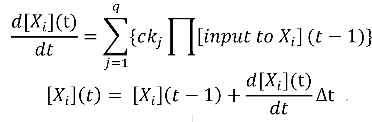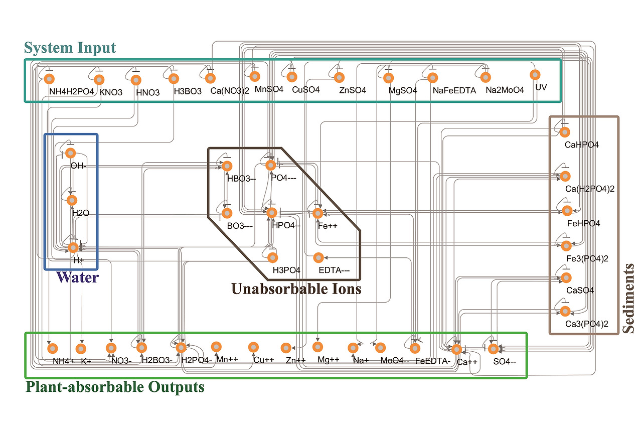 [Xi]는 i라는 이온의 몰농도(molarity)를 의미한다. 화학 반응식에서 어떤 이온이 몇 개 사용되는지 그 개수를 c에 지정하고, k는 반응 속도 상수라는 화학적 상수다. 위 식은 화학반응을 시간에 따라 미분하여 표현한 상미분방정식이라 생각하면 되겠다. 양액 안에 이온이 50개 있다면 위 식을 50번 계산하는 것으로 네트워크의 다음 state를 분석할 수 있다. 이 네트워크를 잘 수렴시키면 양액 복잡계의 거동을 예측할 수 있다. [1]