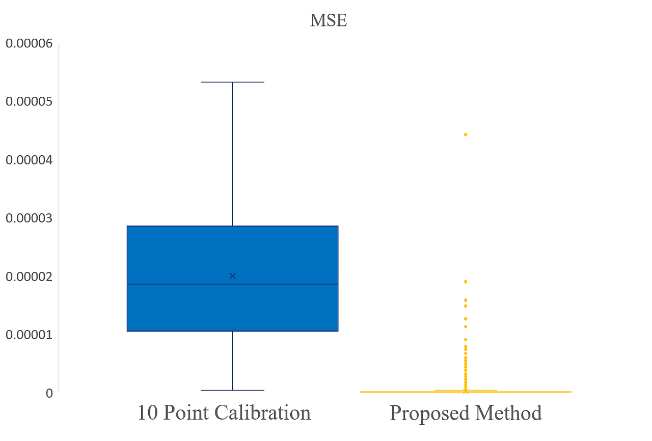 보통 산업계에서 2점 칼리브레이션, 좀 정확하게 한다는 곳에서는 3점 칼리브레이션을 수행한다. 위 그림에서 파란색 그래프는 10점 칼리브레이션으로 구한 값과 이론값 사이의 MSE(mean square error)를 표현한 것이다. 그리고 우측의 노란색 그래프는 AI로 노이즈를 제거한 센서값과 이론값 사이의 MSE다.