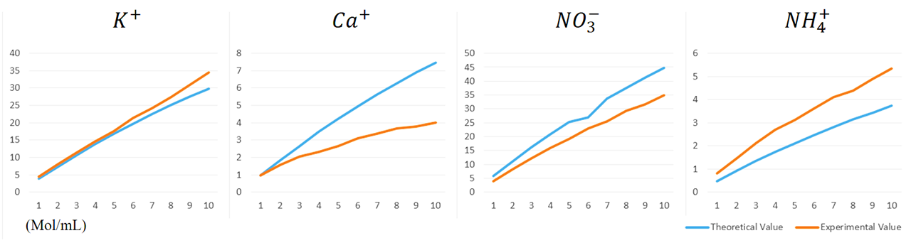 이게 끝이 아니다. 양액에 녹아 있는 이온은 ISE(ion selective elctrode)라는 센서를 활용하여 측정할 수 있는데, 이 센서값이 복잡계에서 제대로 작동하지 않는다. A 이온을 측정하기 위한 센서를 용액에 담그면 B, C, D 등 다른 이온이 A 이온을 끌어당기거나 밀어내면서 센서 전압을 왜곡한다. 혹은 센서에 있는 구멍으로 B, C, D 등 의도치 않은 이온이 밀려들면서 센서의 전압이 왜곡되기도 한다.