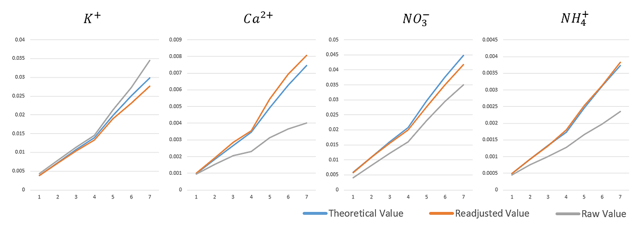 파란색 값이 이론값이며 회색 값은 방해이온효과로 왜곡된 값이다. 주황색 값은 머신러닝으로 보정한 값이다.