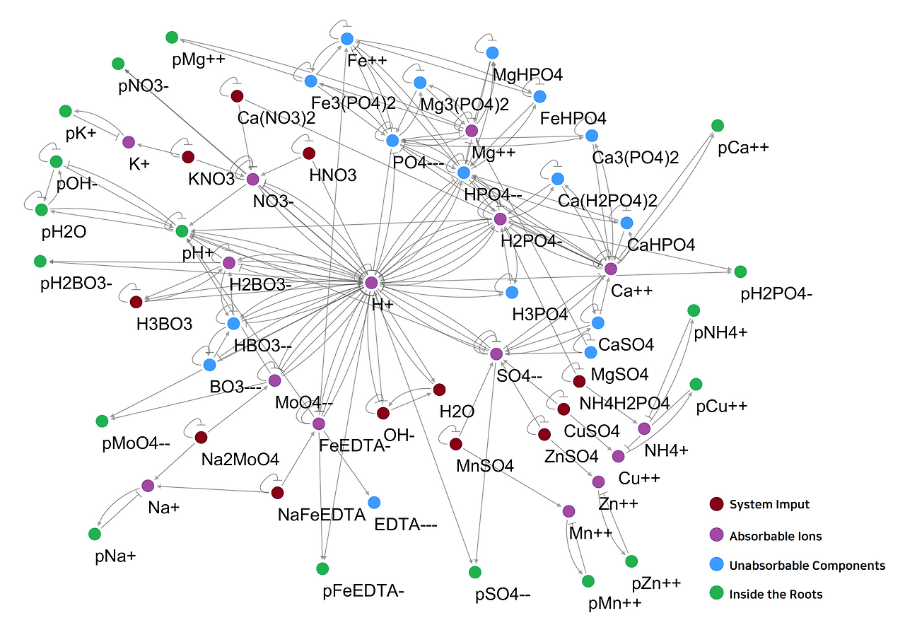양액과 식물 사이의 통신과정을 정성적으로 표현한 시도는 많았지만 정량적으로 표현한 시도는 몇 건 없었다. 그마저도 통계적인 접근인지라 식물 뿌리에서 실질적으로 골드만 방정식(Goldman Equation) 에 따라 양이온이 뿌리 내부로 유입되는 과정을 분석해 놓은 모델이 없었다.