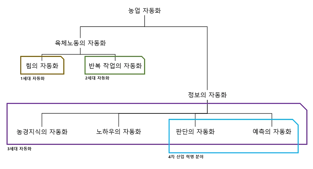 농업의 자동화를 내 멋대로 분류해 봤다. 이번 글에서 소개한 내용은 ‘판단의 자동화’의 하위분류이며, 어떻게 보면 ‘연구의 자동화’에 해당하기도 한다.