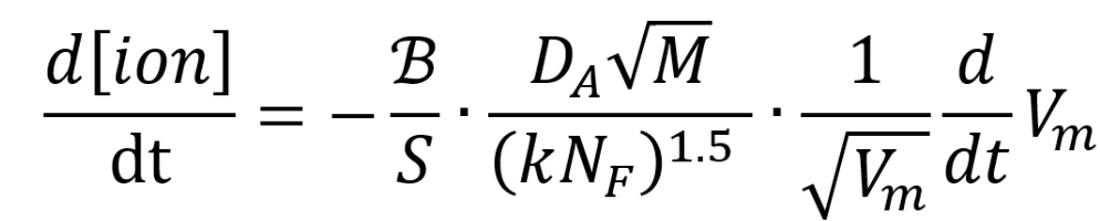 D_A는 이온의 확산상수이며 M은 이온의 분자량이다. 따라서 두 번째 항의 분자인 D_A root(M)은 이온의 물리적 특징을 기술한다.
