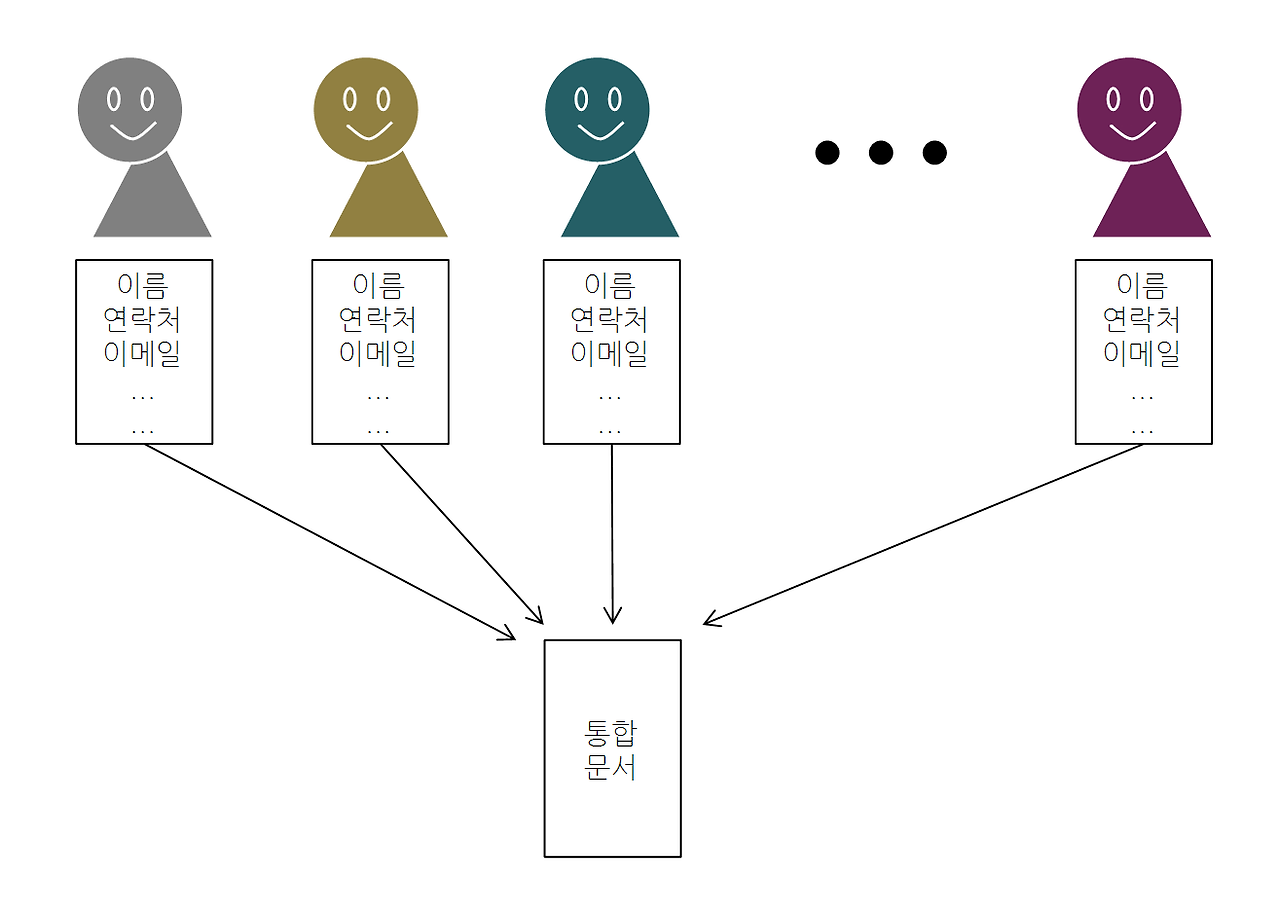 n명의 사람의 개인정보를 합쳐서 하나의 문서로 통합하는 과제 예시