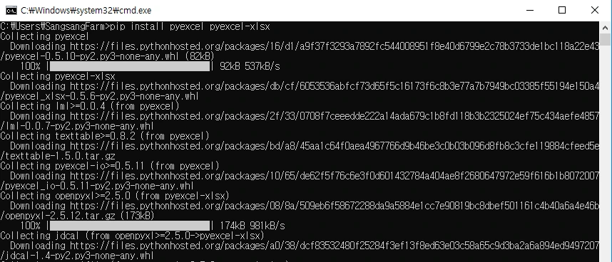 pip은 파이썬을 위한 패키지를 관리해 주는 툴이다. install은 설치를 하라는 의미이다. 즉 위 명령어는 pyexcel과 pyexcel-xlsx라는 패키지를 컴퓨터에 설치하라는 의미다. 더 자세한 사항은 구글에 "파이썬 pip"이라고 검색해 보기 바란다.