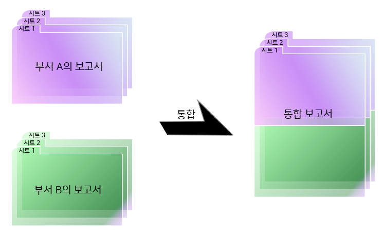부서 A와 B에서 각각 올라온 보고서를 합쳐서 통합 보고서를 작성한다