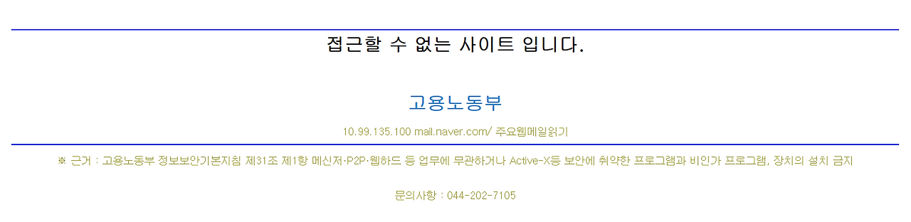 노동청 컴퓨터로는 외부 메일에 접속할 수 없다. 이외에 웹툰, 웹하드도 물론이다. 구글드라이브나 드롭박스, 트렐로 등은 '온라인 오피스'라는 사유로 접속이 차단된다.
