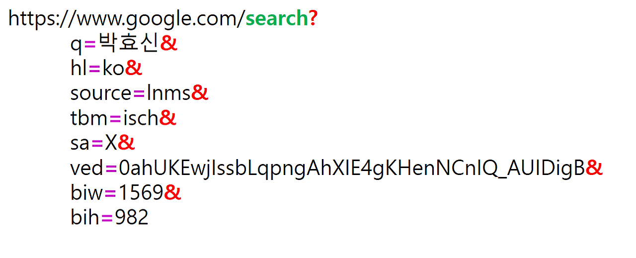 q, hl, source, tbm 등 등호의 왼쪽에 있는 문자들은 함수의 파라미터와 역할이 같을 것이다. 함수가 무엇이고 파라미터가 무엇인지 여러분들은 이미 예전 글을 통하여 배웠을 것이다. 박효신 이라는 한글이 q에 대응하고 있으므로 q의 정체를 가장 쉽게 유추할 수 있을 것 같다. q는 검색어라는 뜻일 것이다. 아마 query의 줄임말이 아닐까?