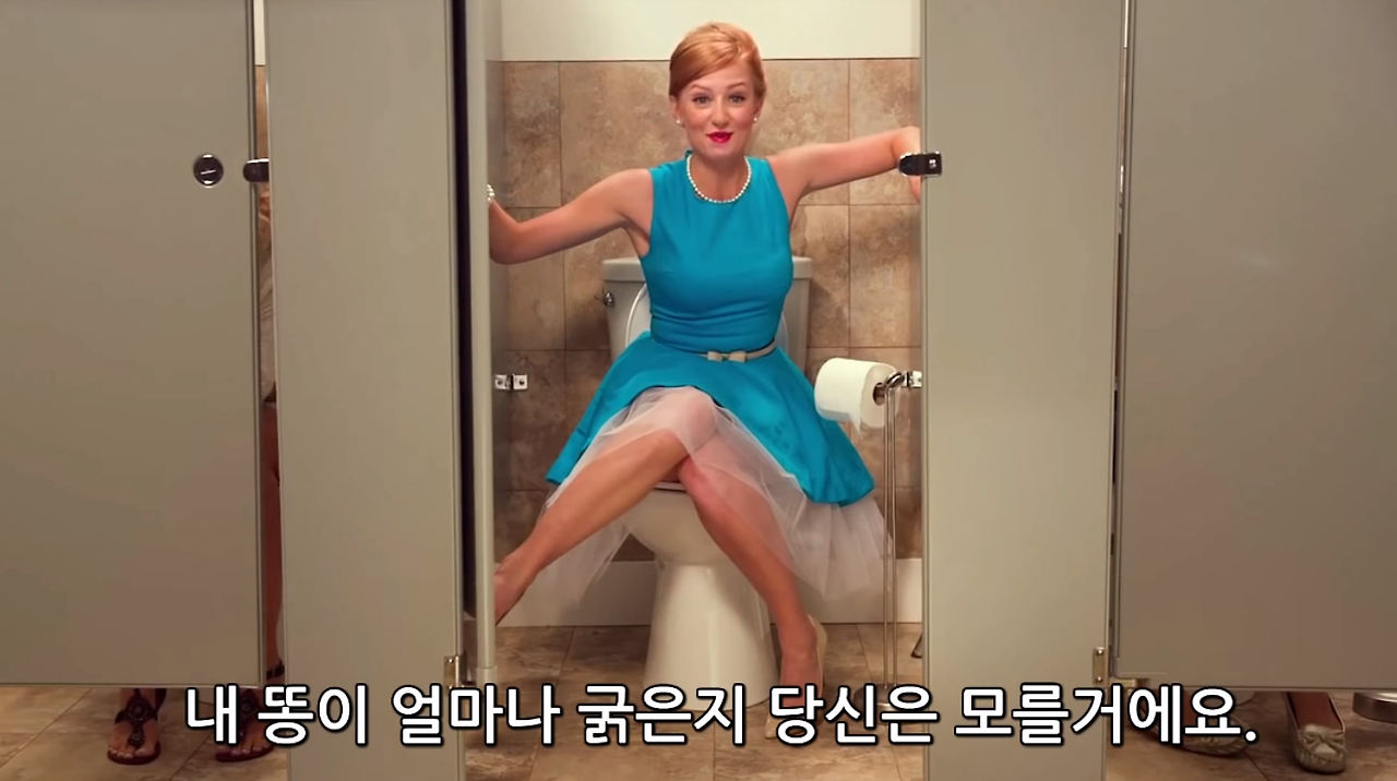 첫 씬부터 영상미가 아주 강력하다. 무채색 화장실 문이 벌컥 열리더니 레이스까지 달린 파란색 원피스를 입고 풀메이크업을 한 금발의 백인여성이 등장한다. 그리고 그녀가 등장하자마자 뱉는 첫 대사가 바로...