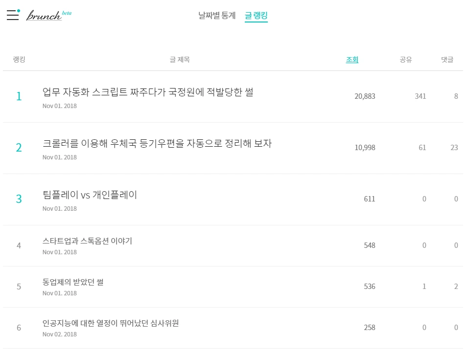 (1) 필자는 콘텐츠를 생산하였을 뿐이고 (2) 비용 지출은 전혀 없었으나 (3) 하룻밤사이 3만여명의 사람이 필자의 브런치를 방문해 글을 읽고 갔다. 이게 광고물이었으면 얼마나 좋았을까. 속이 조금 쓰리지만 SNS 바이럴마케팅의 위력을 체험해 볼 소중한 기회였기에 감사한다.