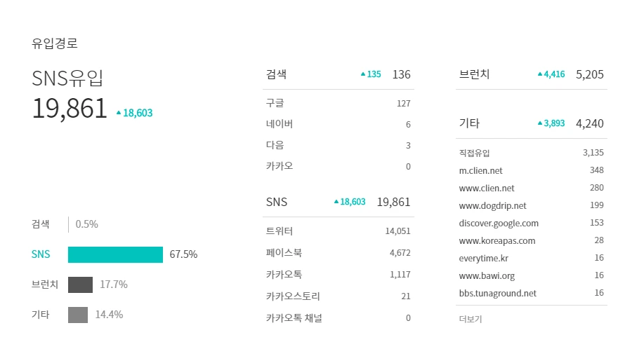 이런 상세한 경로를 추적할 수 있었던 것은 브런치의 통계 툴 덕분이다. 역시 카카오에서 만든 플랫폼이라 그런지 굉장히 강력했다. 유입경로를 저렇게까지 세분화해서 들여볼 수 있다는 것이 너무 신기하다. 원리가 뭘까? 만약 필자가 A라는 서버가 호스팅하는 경로에서 B라는 서버로 이어지는 하이퍼링크를 클릭하면 A서버의 주소가 B서버에 남는건가? 원리야 어떻든 정말로 편리하다.